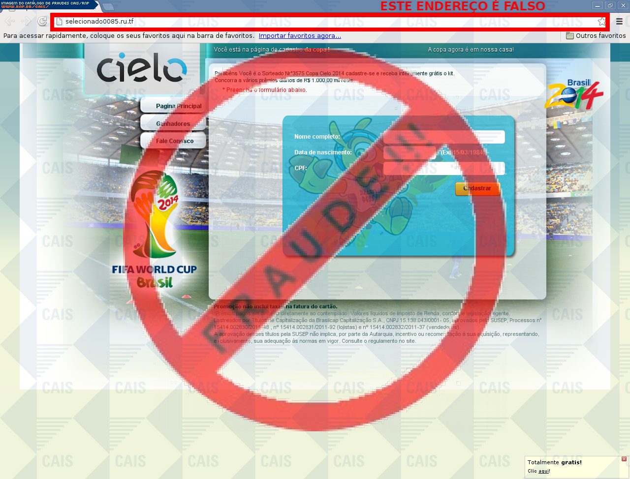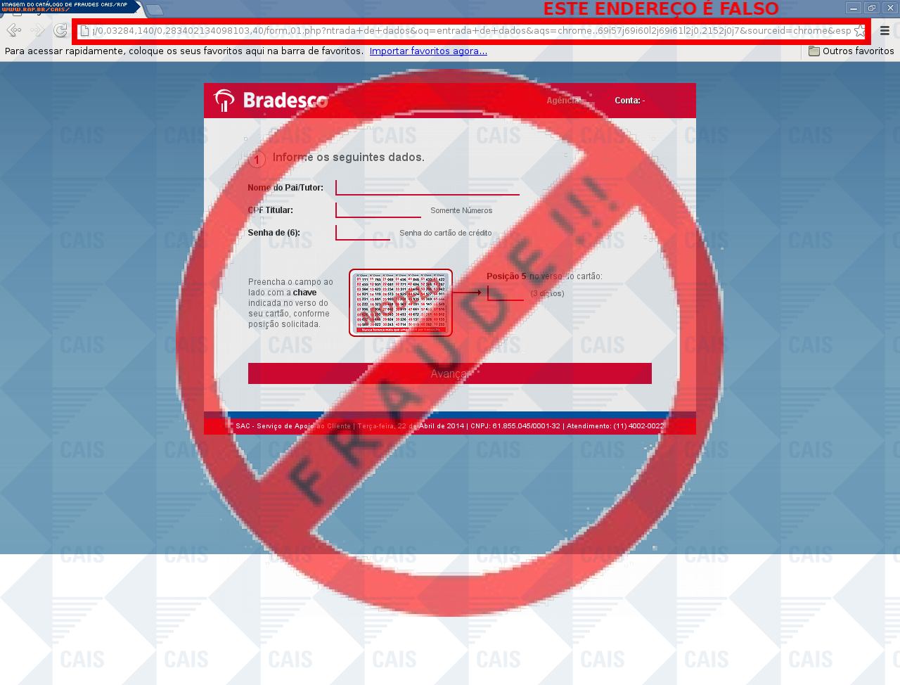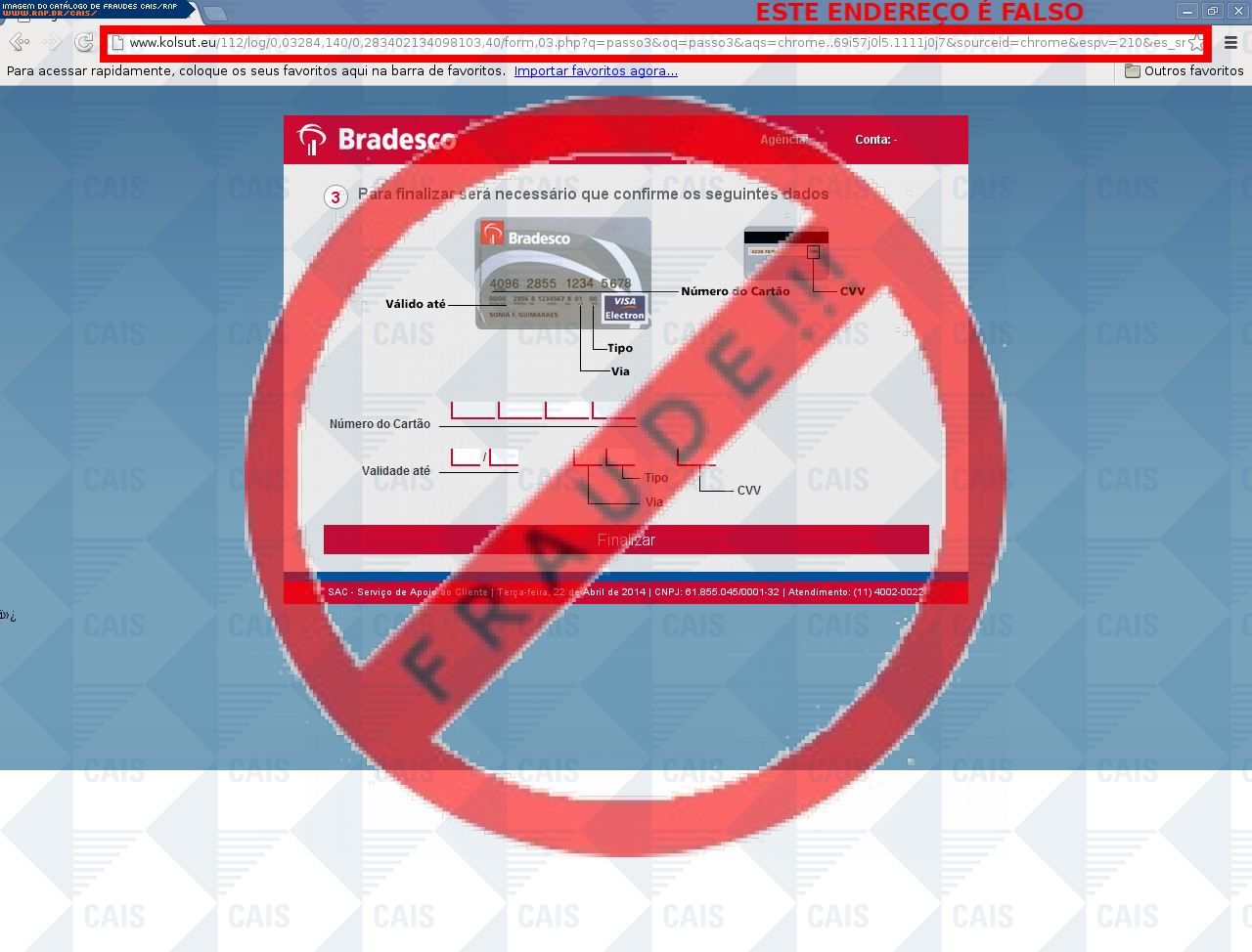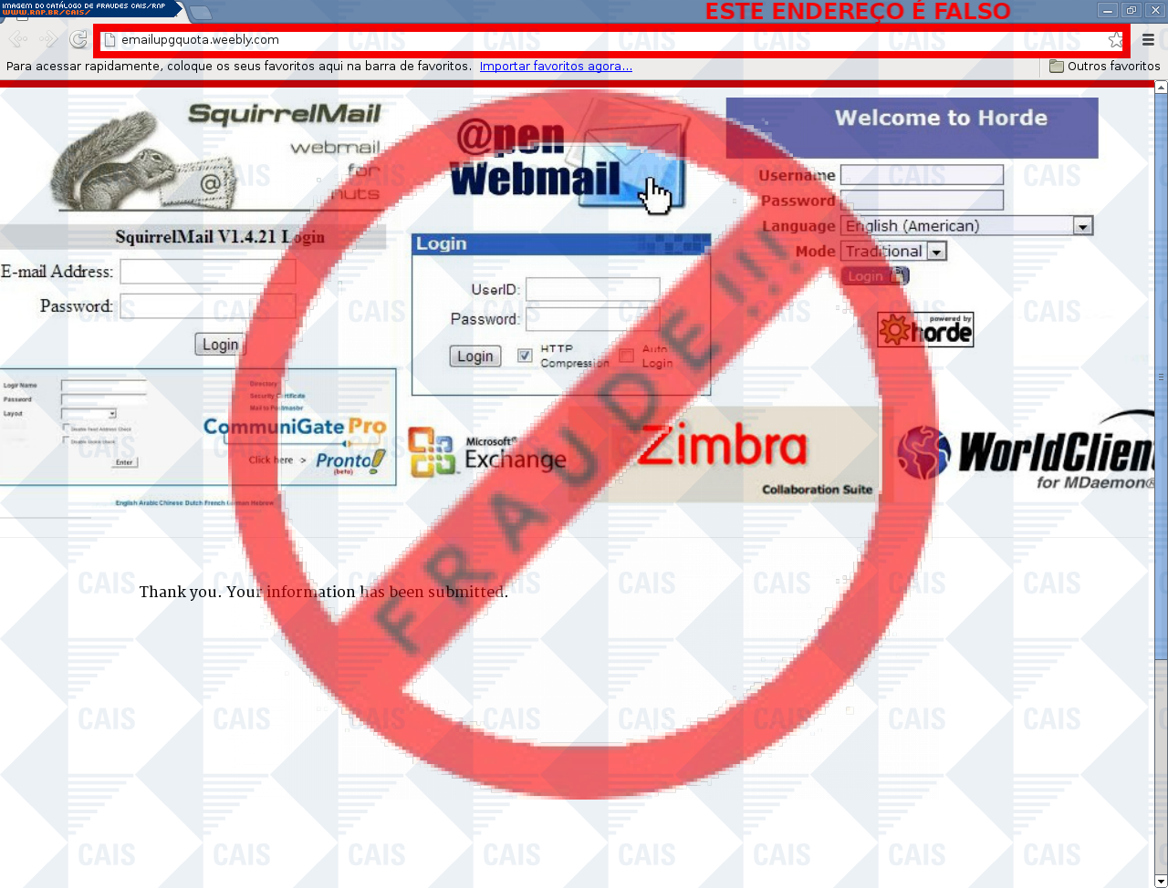 Esta página tem função informativa e educativa. Exibe uma coleção de imagens de phishing scam (fraudes eletrônicas) ou malware (código malicioso) veiculados por meio de spam (e-mail não-solicitado). Trata-se de conteúdo exemplificativo, não exaustivo, uma vez que não é possível contemplar todos os casos de fraudes existentes. Assim, caso você tenha conhecimento de um exemplar que não esteja aqui presente, isto não significa que não seja válido ou real. Inclusive incentivamos que você o envie para análise do CAIS para que, se for o caso, passe a integrar o nosso acervo.