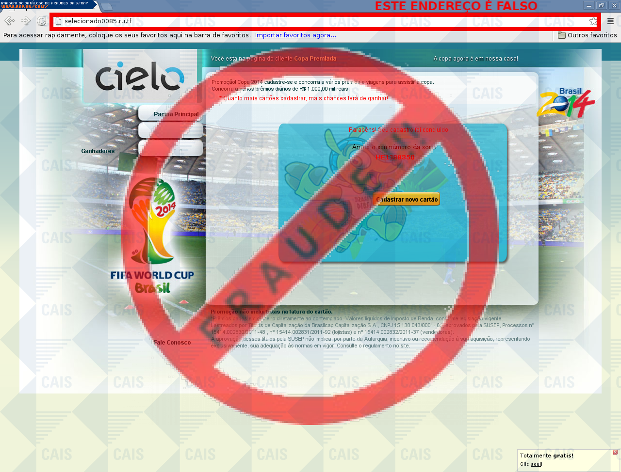 | comentário | A vítima recebe uma mensagem, informando que foi contemplado em uma promoção, mas ao clicar no link para resgatar o prêmio, a vítima é direcionada para uma página falsa, onde pede dados como CPF, cartão de crédito, etc. | |