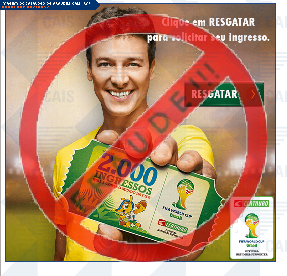 | comentário | A vítima recebe uma mensagem, contendo um link para resgatar seu ingresso da copa, mas ao clicar no link, inicia-se o download de um software malicioso. | |