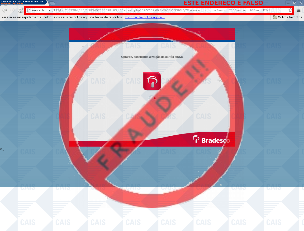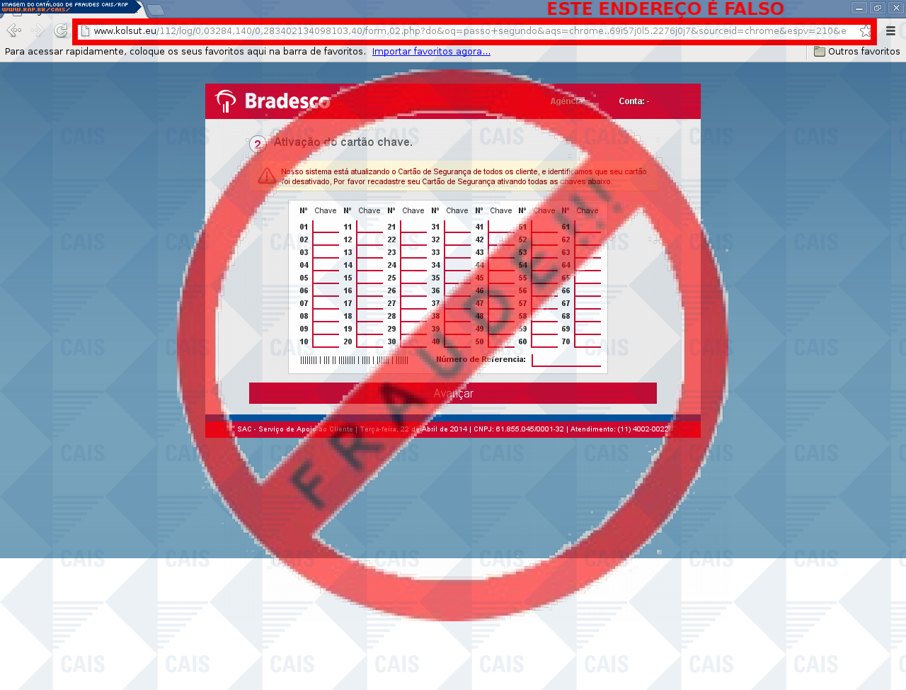 | comentário | A vítima recebe uma mensagem, informando que o uso das suas chaves de segurança expiraram e precisa regularizar. Mas ao clicar no link, a vítima é direcionada para uma página falsa, que é usada na prática de phishing. | |