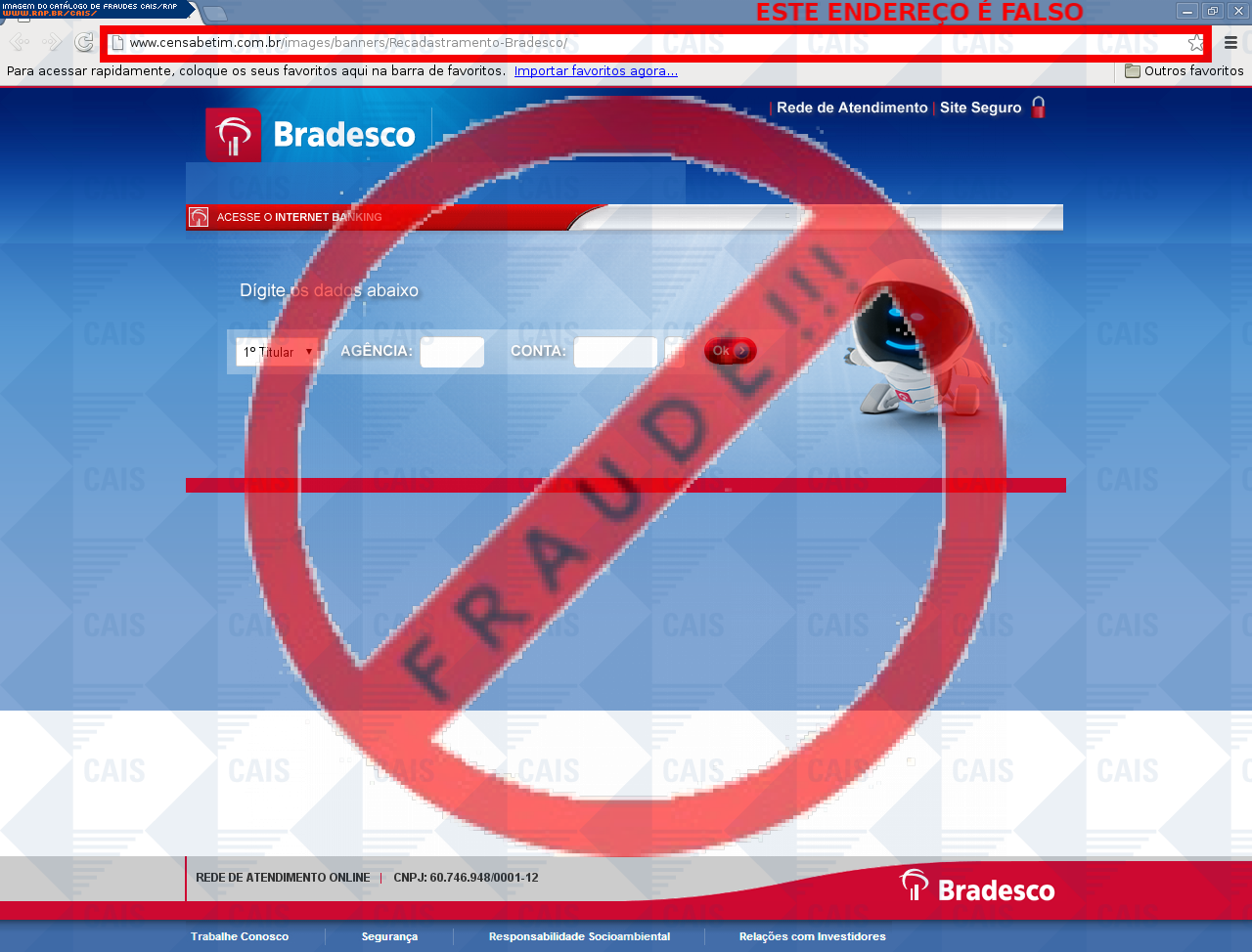 Com a disponibilização pública deste serviço, não é intenção do Centro de Atendimento a Incidentes de Segurança (CAIS) da Rede Nacional de Ensino e Pesquisa (RNP) violar direitos autorais sobre marcas registradas ou logotipos de empresas que porventura constem das amostras. O objetivo é tão somente alertar os usuários sobre as espécies de golpes que se utilizam de tais propriedades intelectuais ou industriais de forma criminosa.