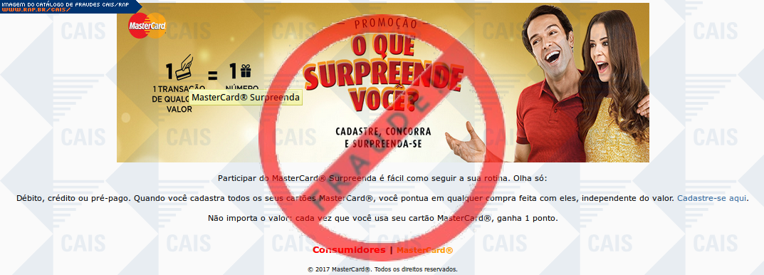 | comentário | A vítima recebe um e-mail informando sobre as vantagens da promoção O QUE SURPREENDE VOCÊ do cartão Mastercard sendo o cadastro através do link disponibilizado, no entanto a página é falsa criada para roubar informações do usuário. | |