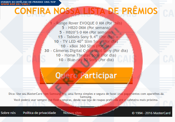 | comentário | A vítima recebe um e-mail informando sobre as vantagens da promoção compra premiada do cartão MasterCard sendo o cadastro através do link disponibilizado, no entanto a página é falsa criada para roubar informações do usuário. | |