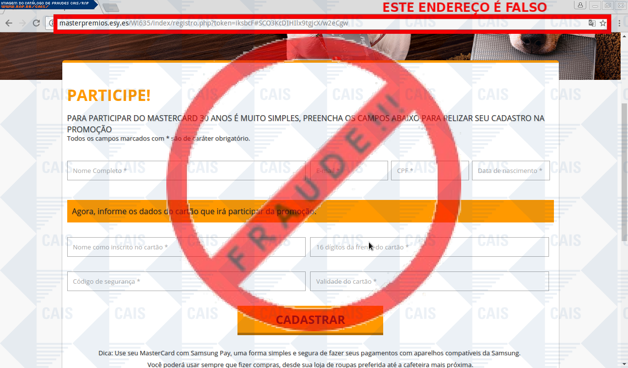 | comentário | A vítima recebe um e-mail informando sobre as vantagens da promoção compra premiada do cartão Mastercard sendo o cadastro através do link disponibilizado, no entanto a página é falsa criada para roubar informações do usuário. | |
