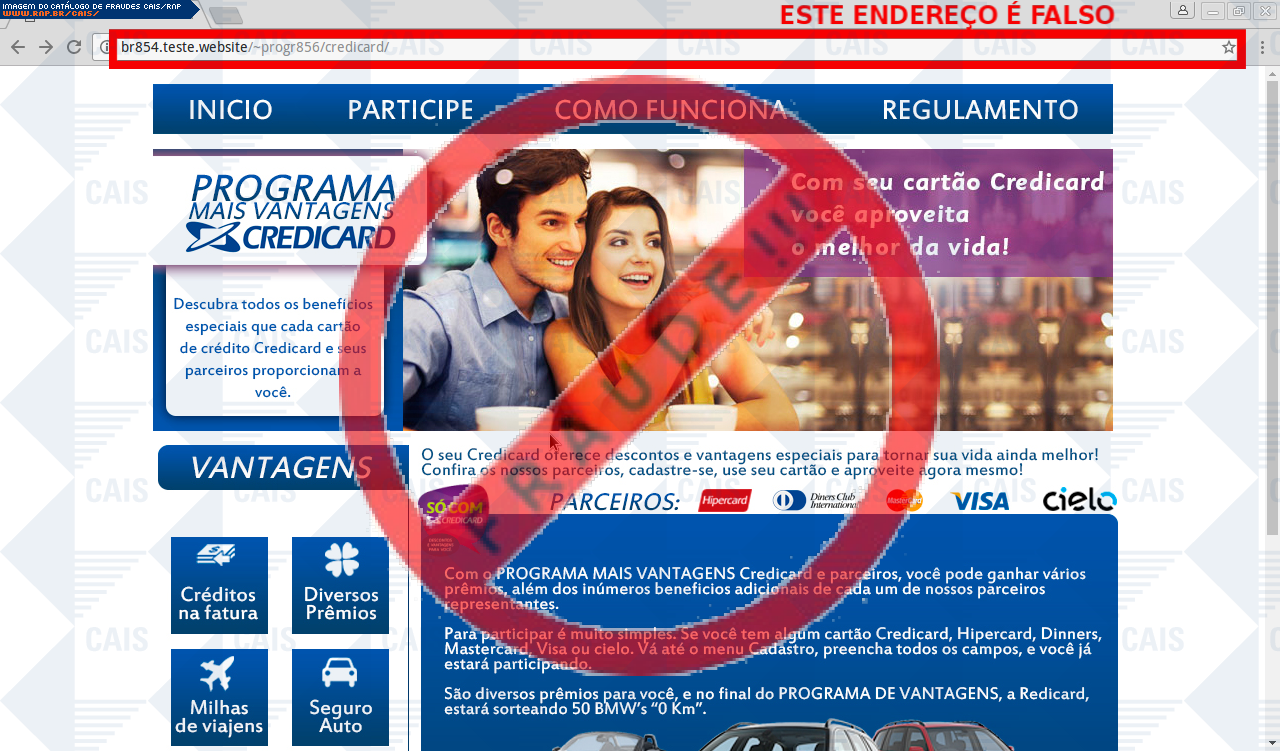 | comentário | A vítima recebe um e-mail informando sobre as vantagens de uso do cartão Credicard para participar de premiações sendo necessário realizar um cadastro através do link disponibilizado, no entanto a página é falsa criada para roubar informações do usuário. | |