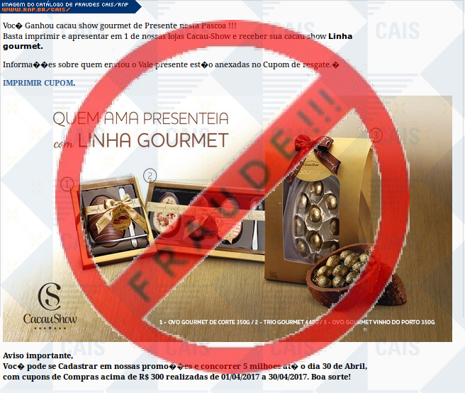 | assunto | [PARABENS]: Voc� Ganhou cacau show gourmet de Presente nesta Pascoa !!! | |