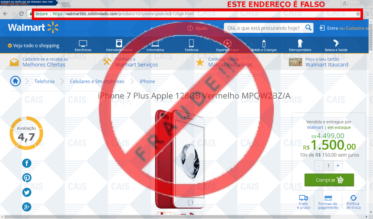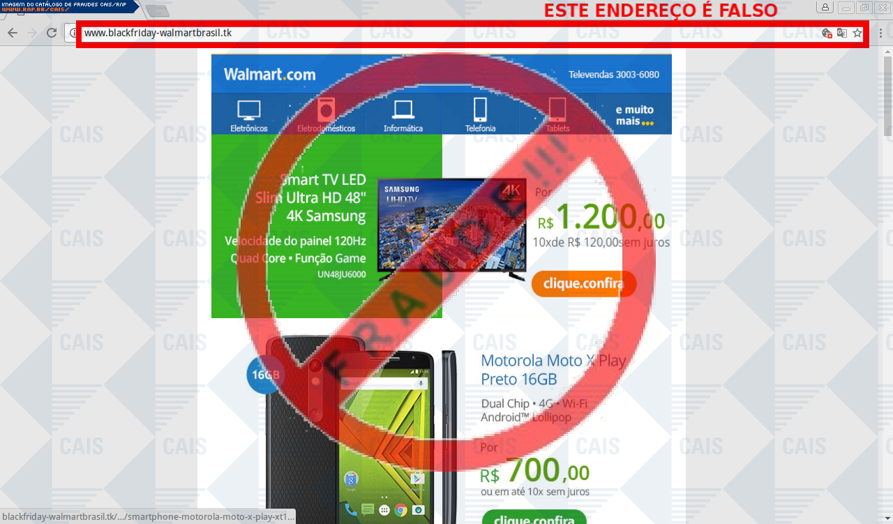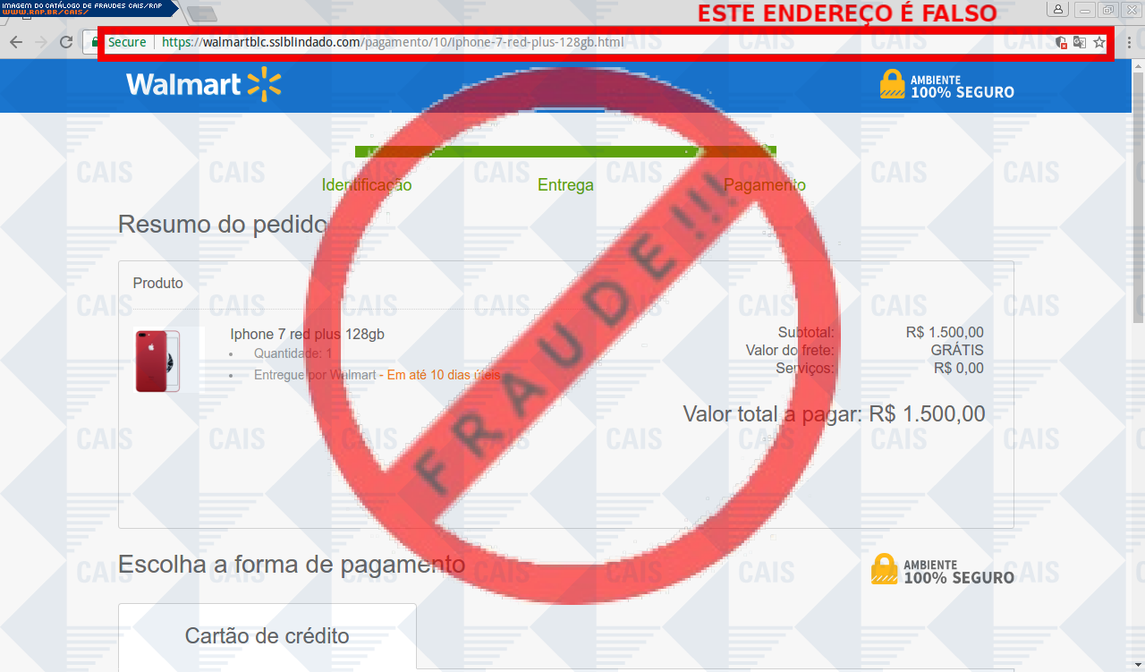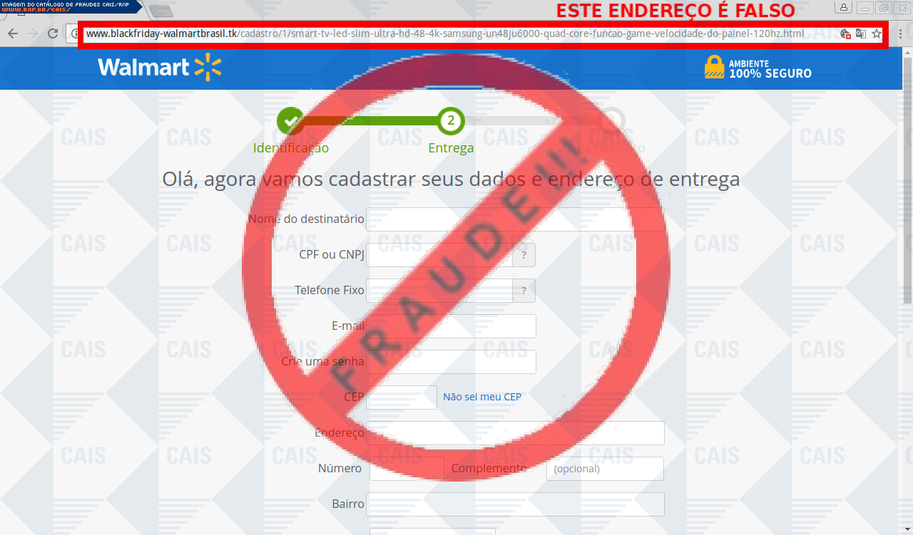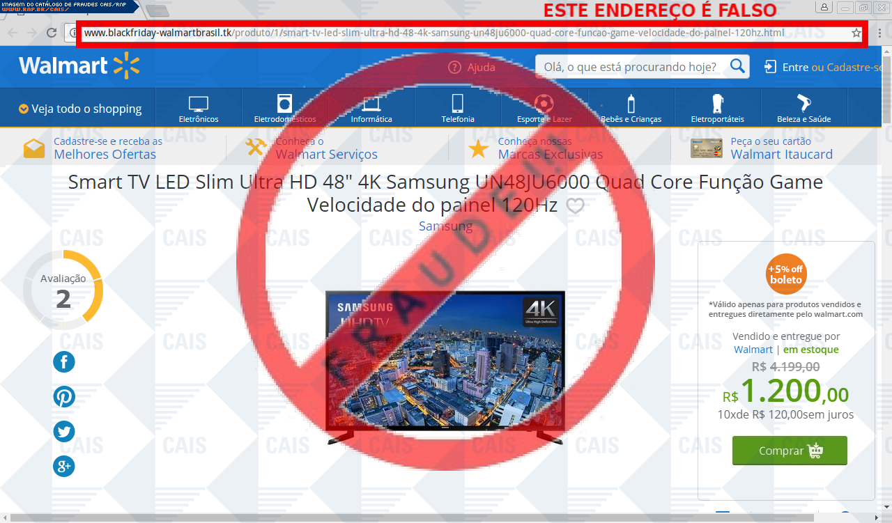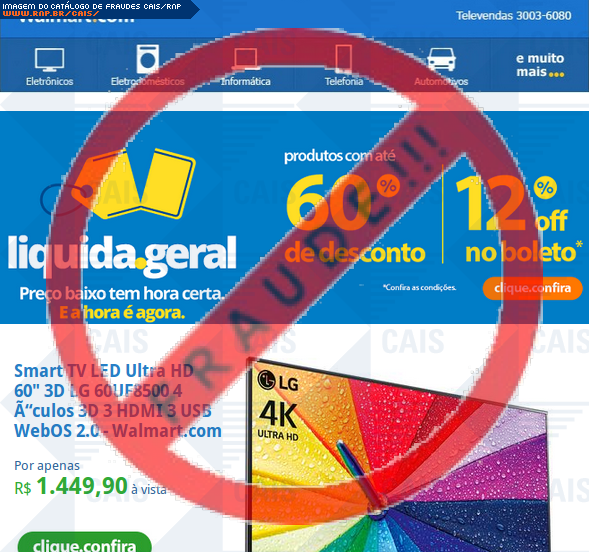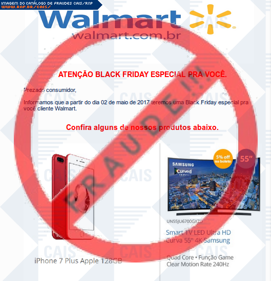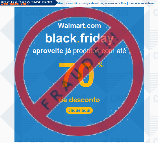 | comentário | A vítima recebe um e-mail informando sobre promoções no site de compra da Walmart disponibilizando link de vários produtos em desconto, no entanto a página é falsa destinada a roubar as informações pessoais e do cartão de crédito/débito do usuário. | |