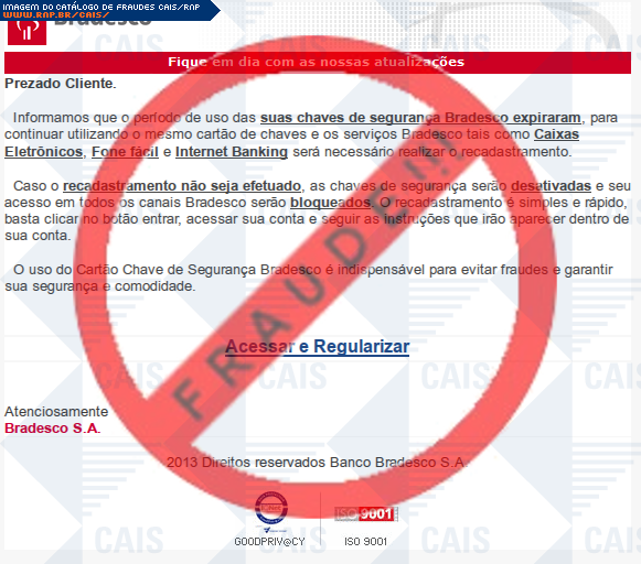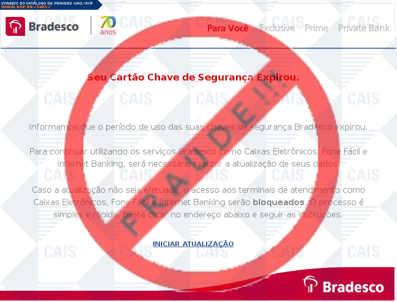 | comentário | O usuário recebe um e-mail informando que as suas chaves de segurança para acesso aos serviços do banco encontram-se expiradas, mas quando o mesmo acessa o site para realizar a atualização é levado a um site falso usado na pratica de phishing e muito semelhante... (leia mais) | |