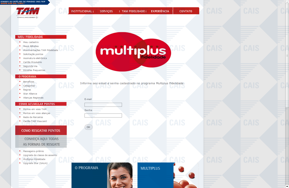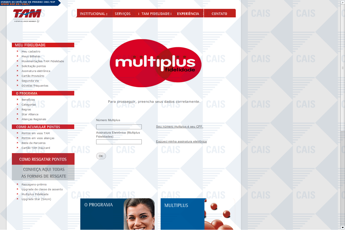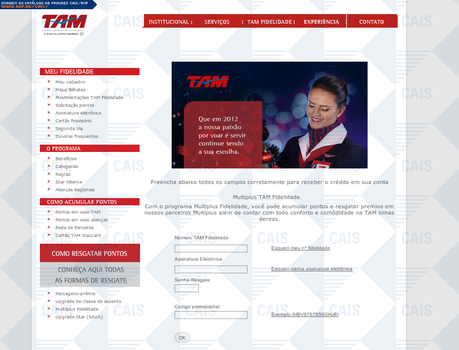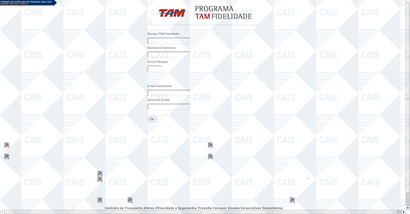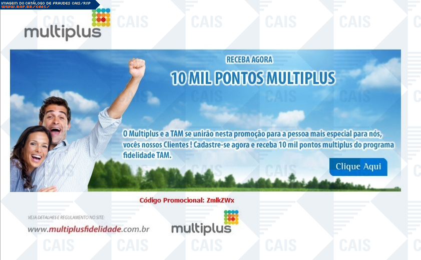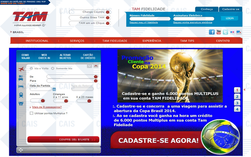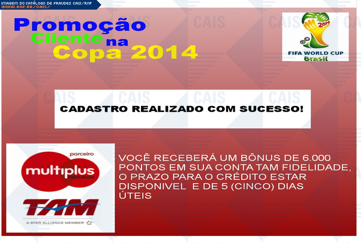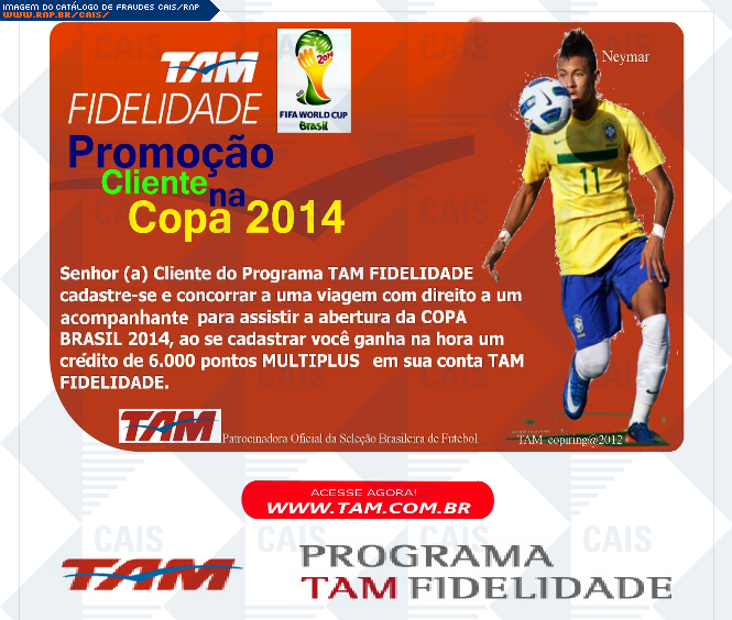 | comentário | Mensagem falsa em nome da TAM com um link para o cadastro em uma promoção na qual a vítima concorreria a uma viagem e ingressos para a abertura da copa do mundo de 2014. O link leva a um site falso que tem o objetivo de roubar dados pessoais da vítima. | |