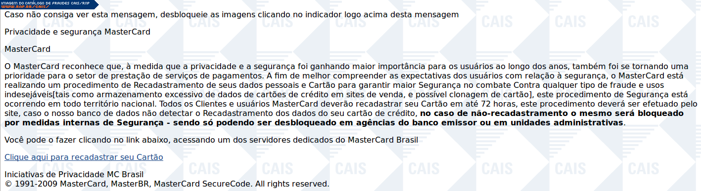 | assunto | MasterCard - Recadastramento URGENTE. | |