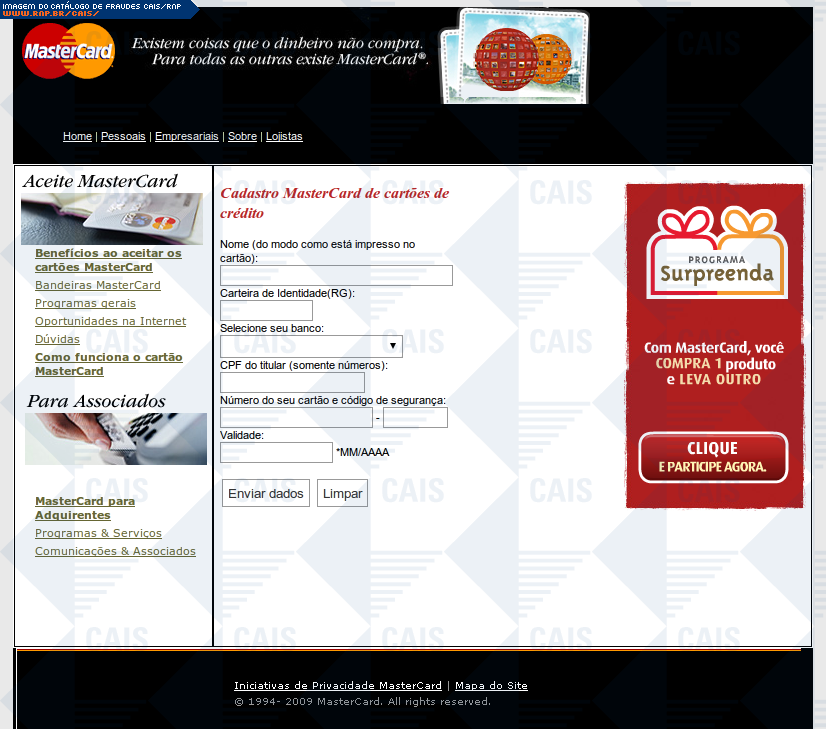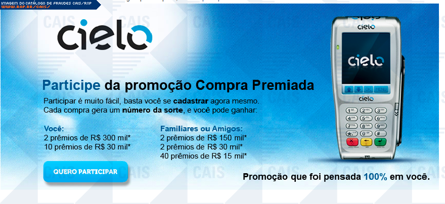 | comentário | Fraude em nome da Cielo oferece participação em promoção. O link disponível para cadstro, na verdade, leva à uma falsa página da Cielo, na qual dados confidenciais são solicitados. | |