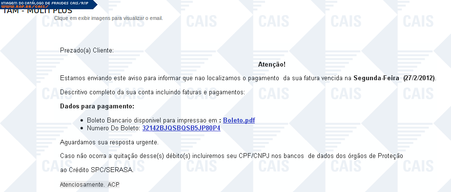 Esta página tem função informativa e educativa. Exibe uma coleção de imagens de phishing scam (fraudes eletrônicas) ou malware (código malicioso) veiculados por meio de spam (e-mail não-solicitado). Trata-se de conteúdo exemplificativo, não exaustivo, uma vez que não é possível contemplar todos os casos de fraudes existentes. Assim, caso você tenha conhecimento de um exemplar que não esteja aqui presente, isto não significa que não seja válido ou real. Inclusive incentivamos que você o envie para análise do CAIS para que, se for o caso, passe a integrar o nosso acervo.