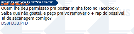 | comentário | Falsa mensagem sobre postagem indevida de foto no facebook disponibiliza um link com provável malware. O link, contudo, não estava ativo no momento da análise. | |