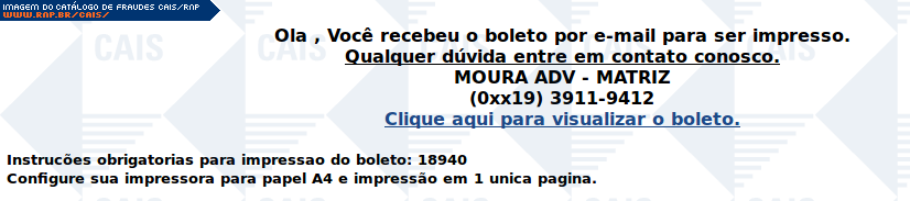 | comentário | Mensagem em nome de Moura Advogados disponibiliza um suposto boleto para pagamento. Tal boleto, contudo, trata-se de um malware identificado como: Generic.Banker.OT.E7D5E69E ( Bit Defender). | |