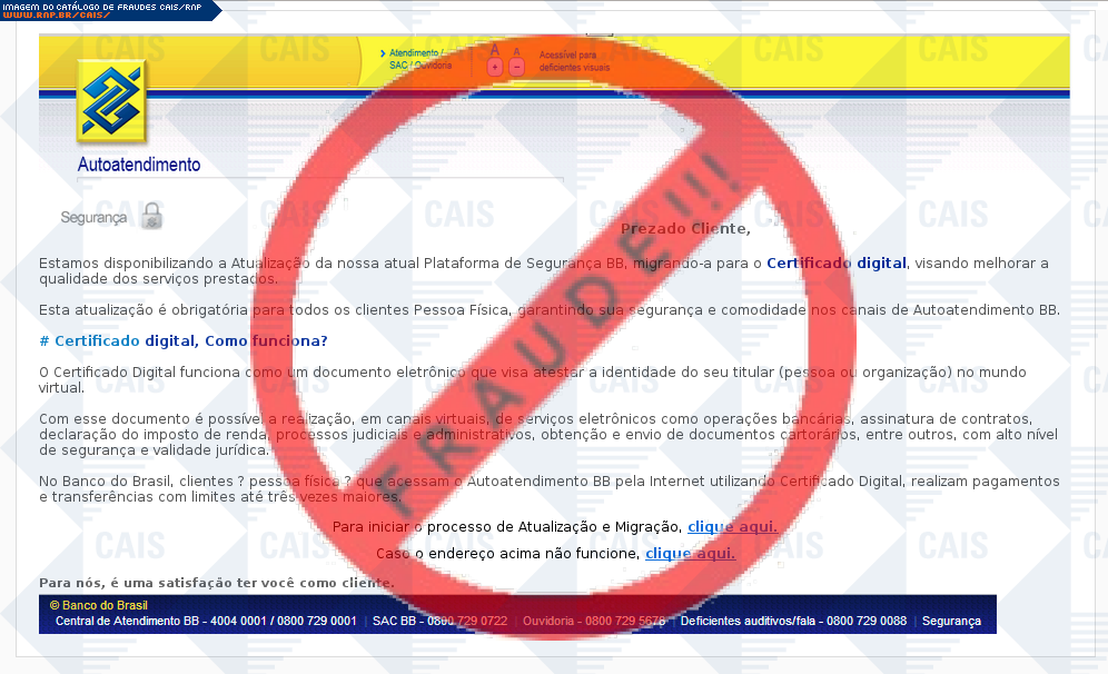 | comentário | O usuário recebe uma mensagem informando sobre a atualização para o certificado digital das contas do Banco do Brasil estando a página para essa atualização disponível para download, no entanto a página é falsa destinada a roubar as informações bancárias... (leia mais) | |