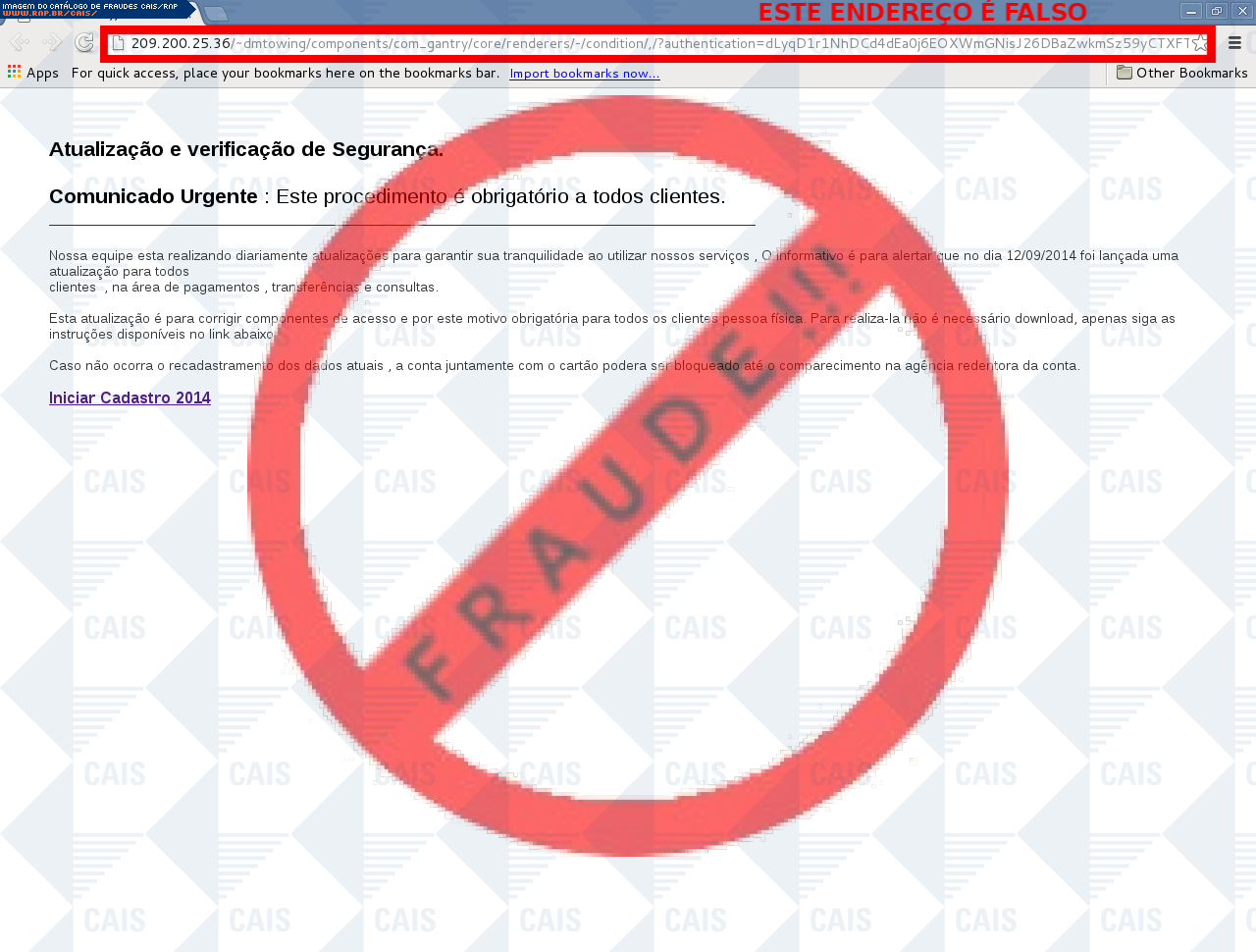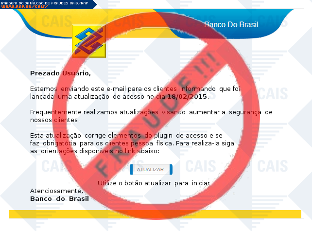 Esta página tem função informativa e educativa. Exibe uma coleção de imagens de phishing scam (fraudes eletrônicas) ou malware (código malicioso) veiculados por meio de spam (e-mail não-solicitado). Trata-se de conteúdo exemplificativo, não exaustivo, uma vez que não é possível contemplar todos os casos de fraudes existentes. Assim, caso você tenha conhecimento de um exemplar que não esteja aqui presente, isto não significa que não seja válido ou real. Inclusive incentivamos que você o envie para análise do CAIS para que, se for o caso, passe a integrar o nosso acervo.