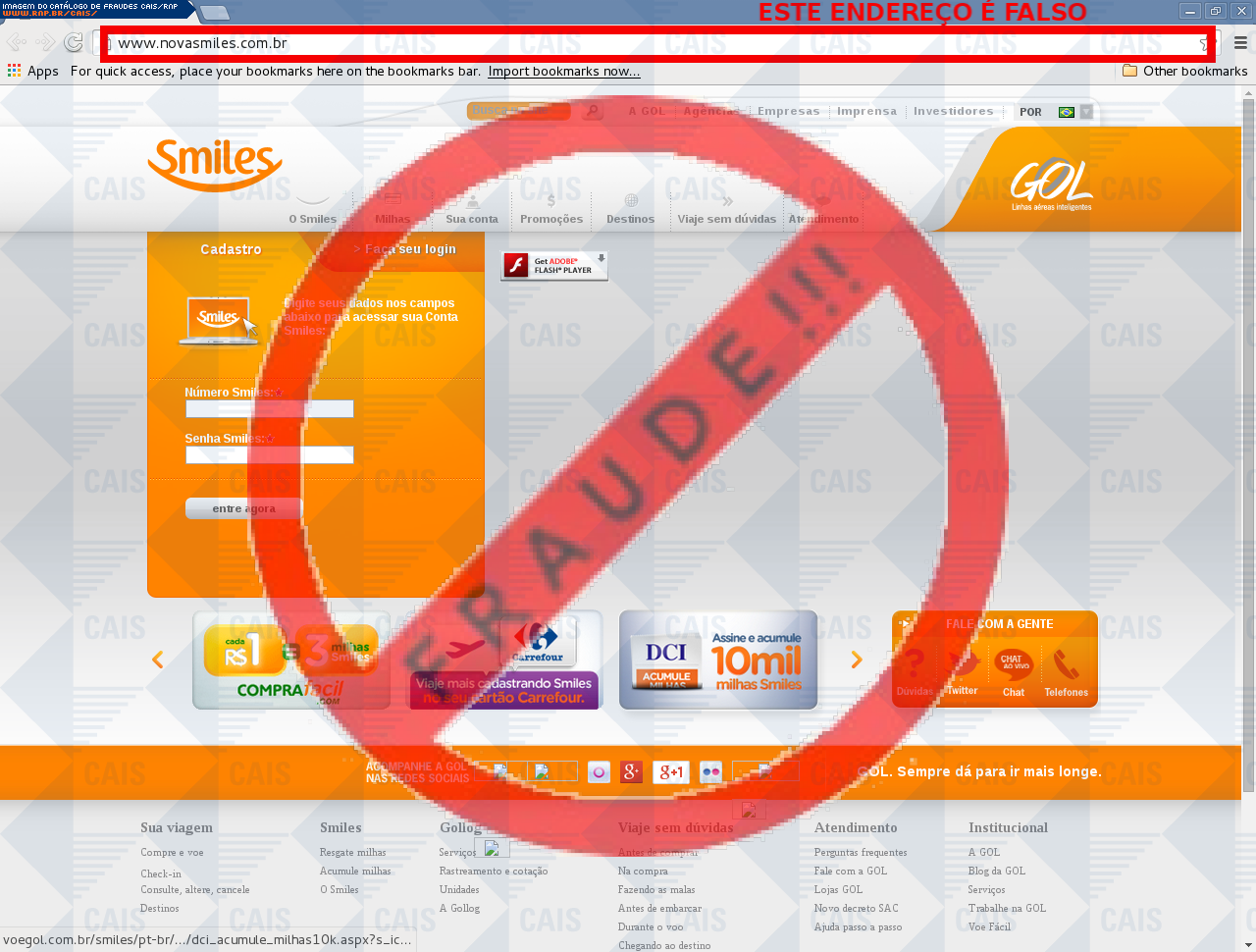 | comentário | O usuário recebe uma mensagem informando sobre o programa de pontos da companhia aérea Gol juntamente com o Banco do Brasil com o link para inscrição disponível. Entretanto o site é falso criado para roubar dados pessoais da vítima. | |