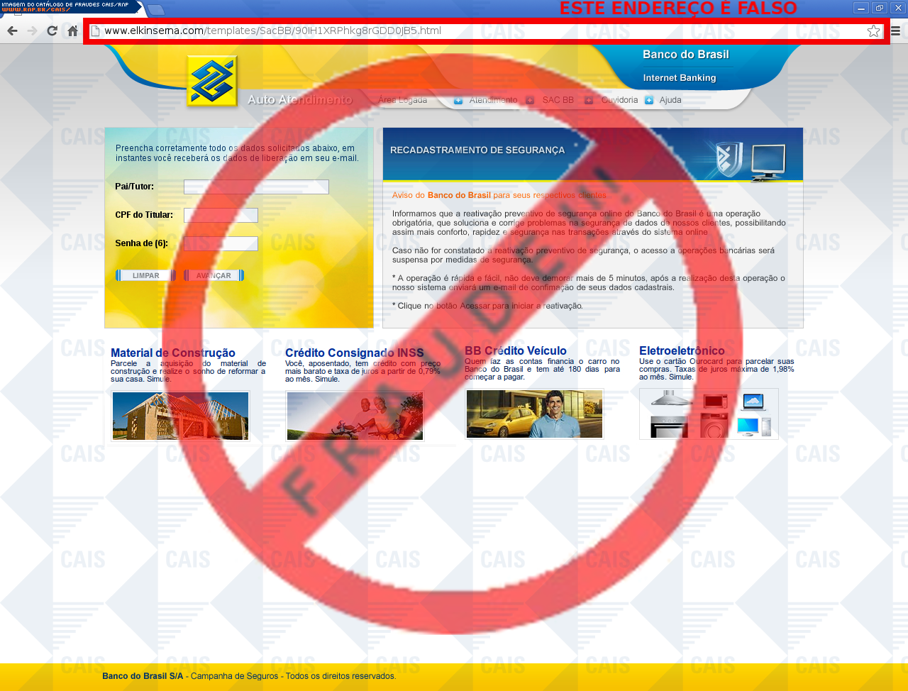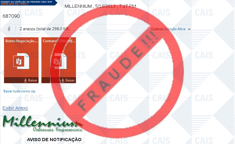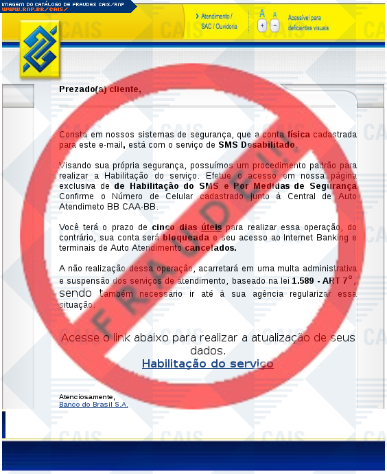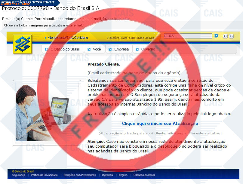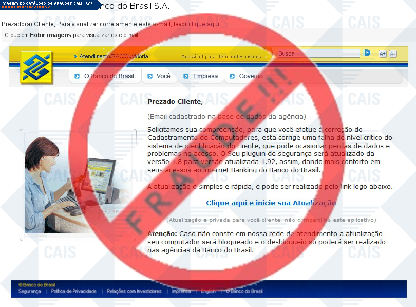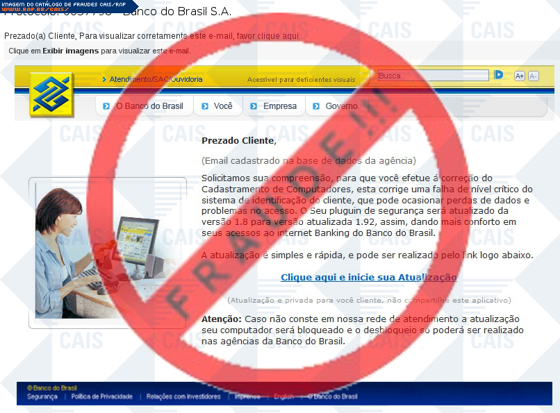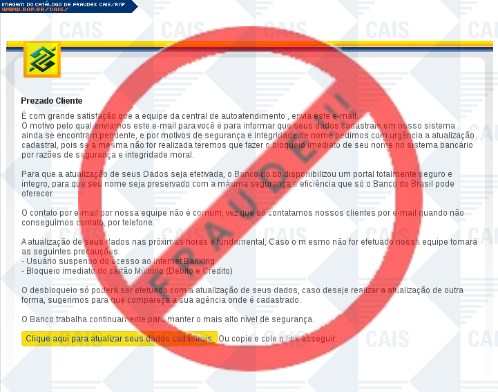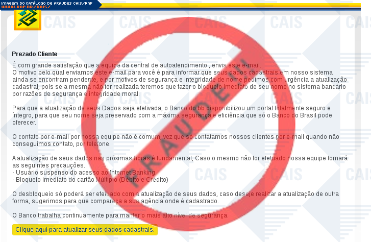 Esta página tem função informativa e educativa. Exibe uma coleção de imagens de phishing scam (fraudes eletrônicas) ou malware (código malicioso) veiculados por meio de spam (e-mail não-solicitado). Trata-se de conteúdo exemplificativo, não exaustivo, uma vez que não é possível contemplar todos os casos de fraudes existentes. Assim, caso você tenha conhecimento de um exemplar que não esteja aqui presente, isto não significa que não seja válido ou real. Inclusive incentivamos que você o envie para análise do CAIS para que, se for o caso, passe a integrar o nosso acervo.