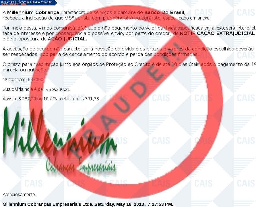 | assunto | 5/18/2013 MILENNIUM COBRANÇA Saturday, May 18, 2013 AVISO DE NOTIFICAÇÃO EXTRAJUDICIAL - 687090 Saturday, May 18, 2013 7:17:53 PM | |