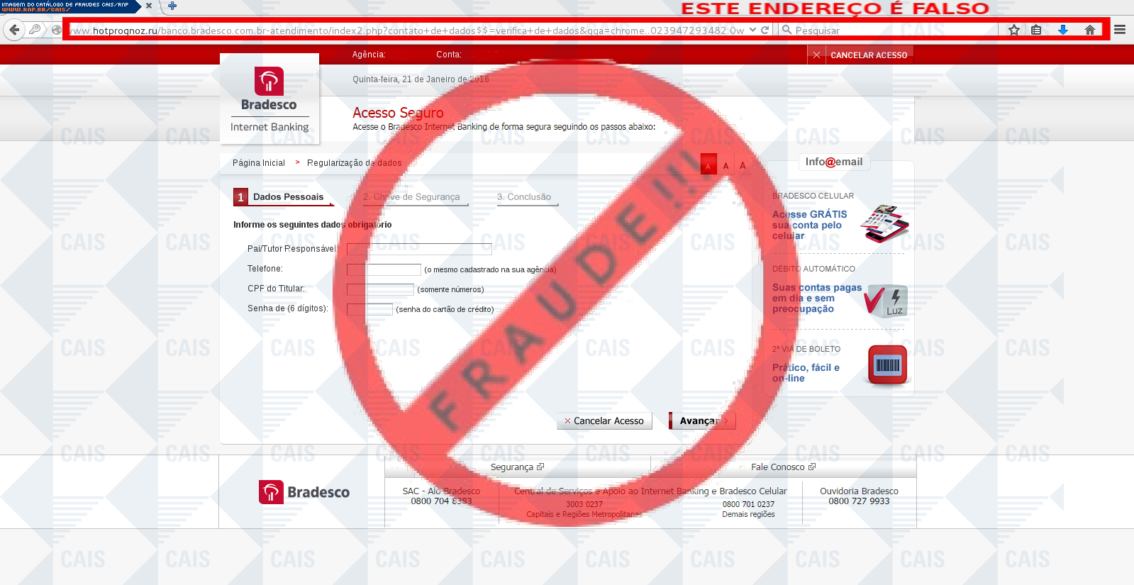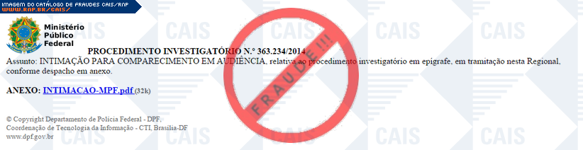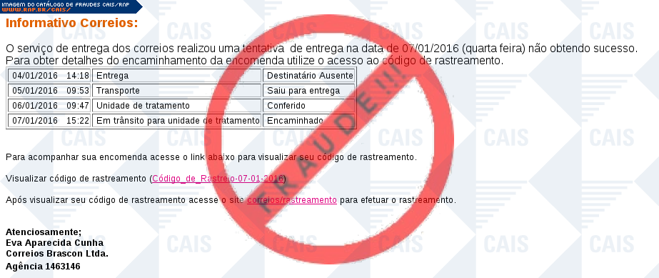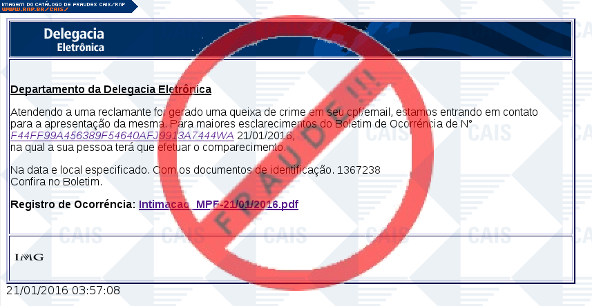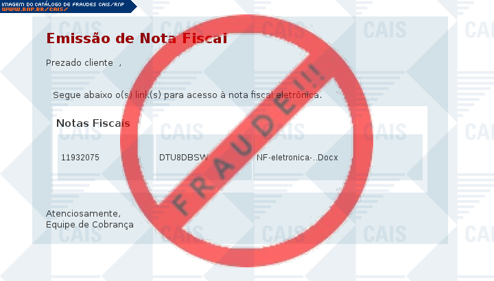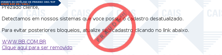 Esta página tem função informativa e educativa. Exibe uma coleção de imagens de phishing scam (fraudes eletrônicas) ou malware (código malicioso) veiculados por meio de spam (e-mail não-solicitado). Trata-se de conteúdo exemplificativo, não exaustivo, uma vez que não é possível contemplar todos os casos de fraudes existentes. Assim, caso você tenha conhecimento de um exemplar que não esteja aqui presente, isto não significa que não seja válido ou real. Inclusive incentivamos que você o envie para análise do CAIS para que, se for o caso, passe a integrar o nosso acervo.