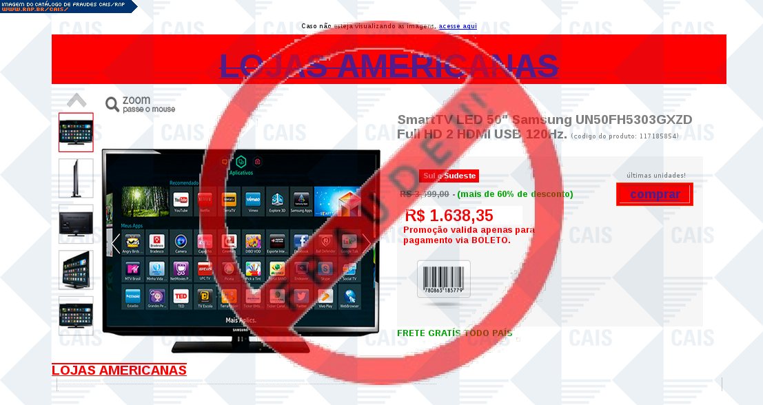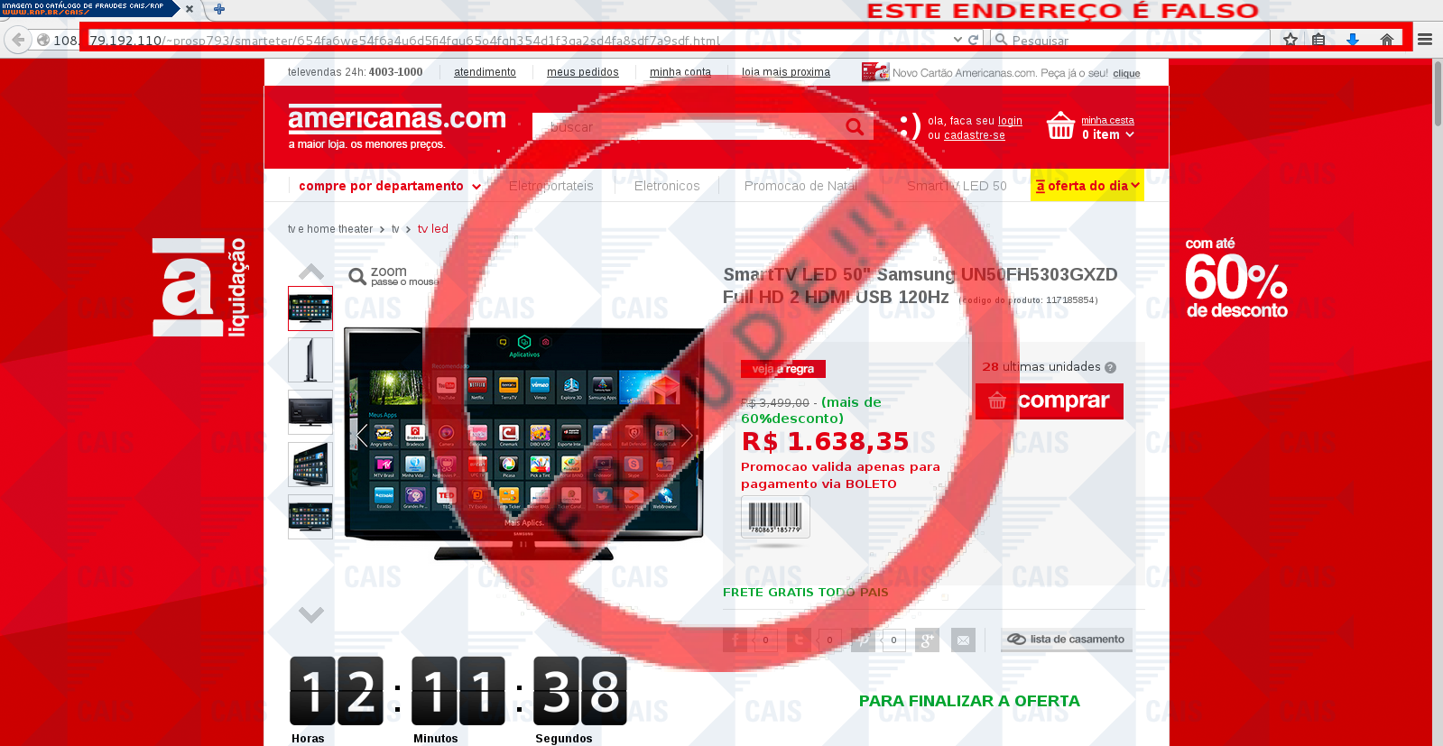 | comentário | A vítima recebe um email com uma suposta promoção de Smart TV das Lojas Americanas, com um link para a compra e impressão do boleto para pagamento. Entretanto, o link leva a uma página falsa, que tenta enganar a vítima fazendo com que ela pague um boleto... (leia mais) | |