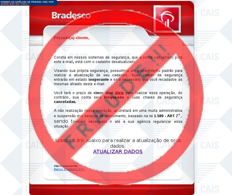 | comentário | A vítima recebe uma mensagem dizendo que seu cadastro no Bradesco está desatualizado e que necessita fazer a atualização através de um link passado no email, caso contrário sua conta será bloqueada. Entretanto, o link leva a uma página falsa que tenta roubar... (leia mais) | |
