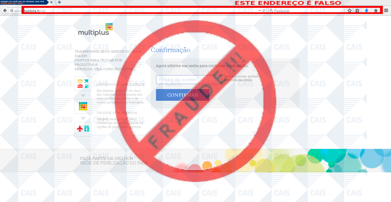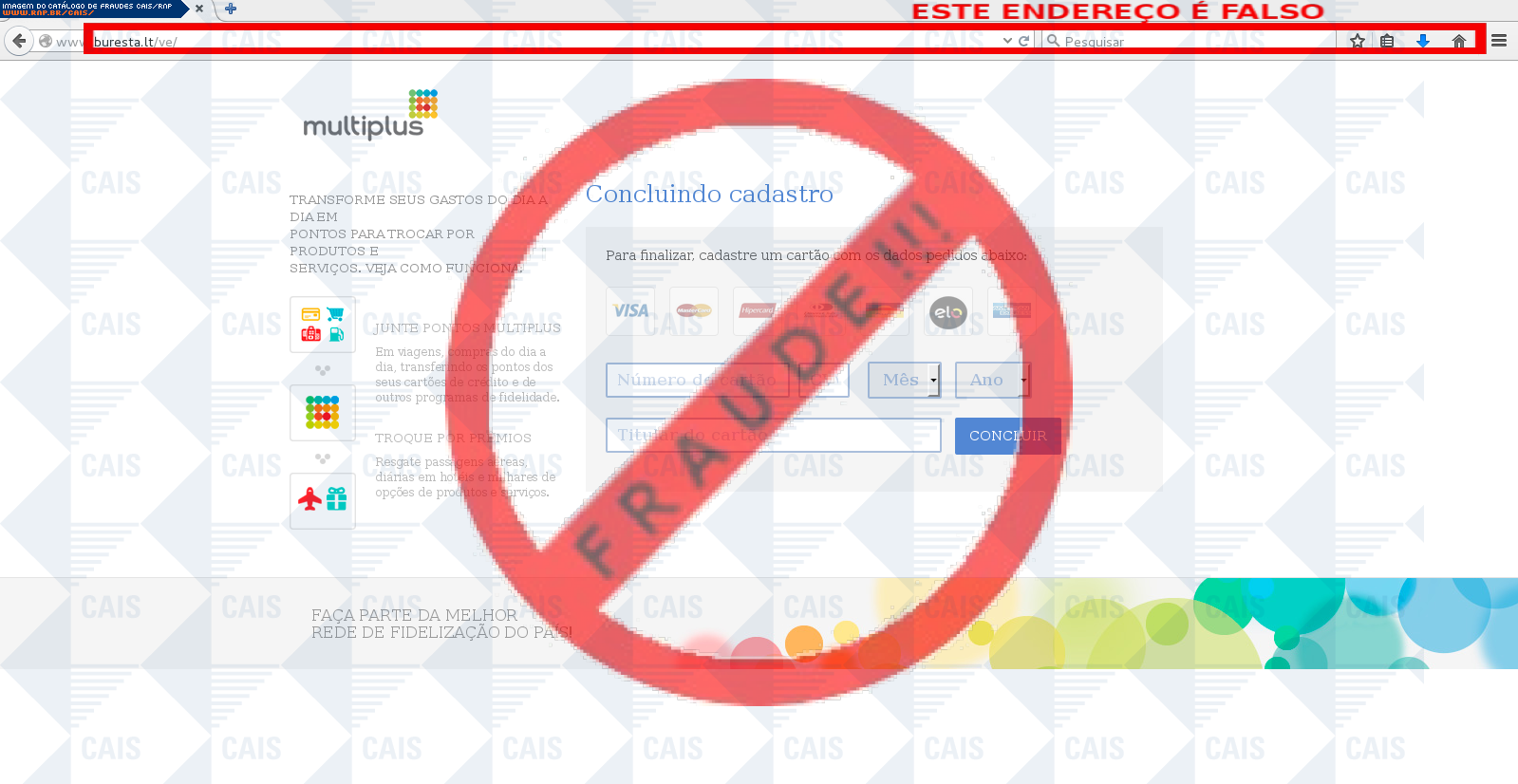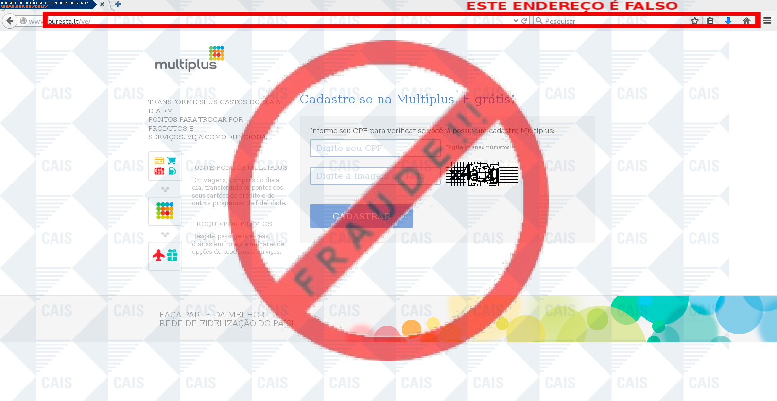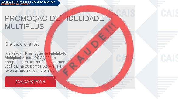 | comentário | A vítima recebe uma mensagem informando sobre uma suposta promoção da Multiplus e oferece um link para cadastro. Entretanto, o link leva a uma página falsa que tenta roubar informações de cartão de crédito da vítima. | |