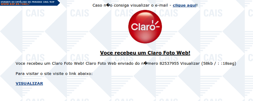 | comentário | Mensagem falsa informando que a vítima recebeu um Claro foto web. O conteúdo malicioso não estava disponível no momento da análise. | |