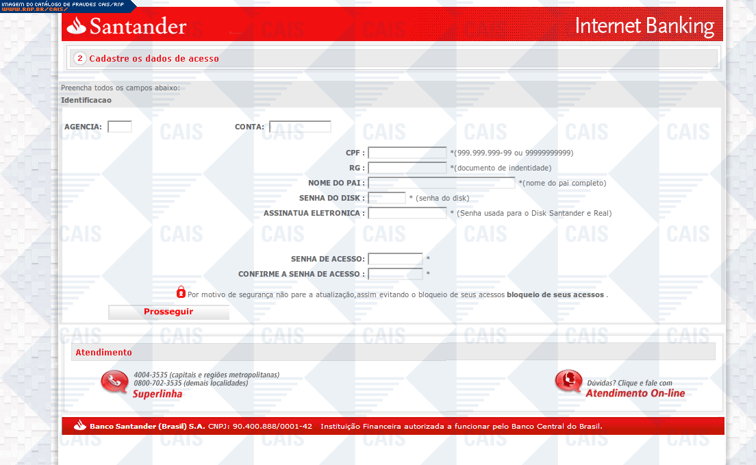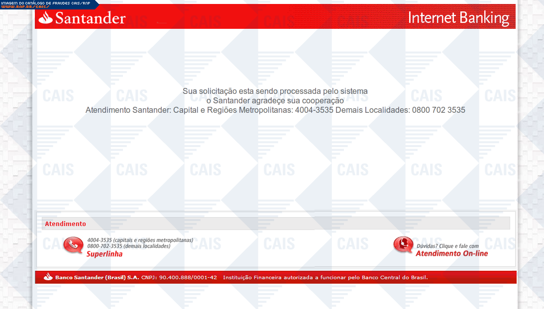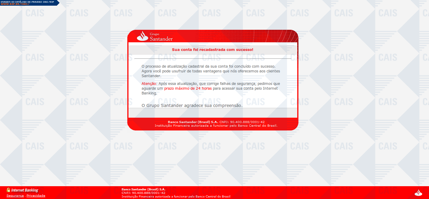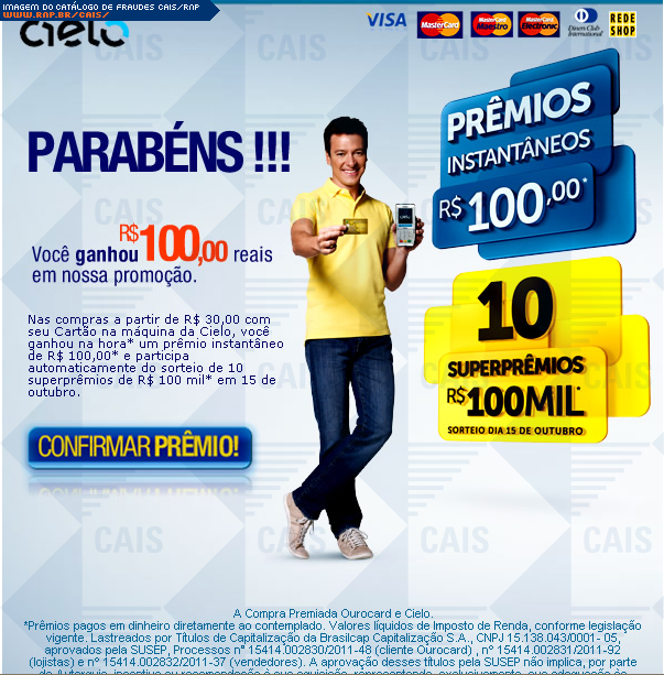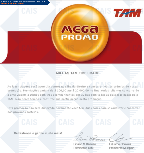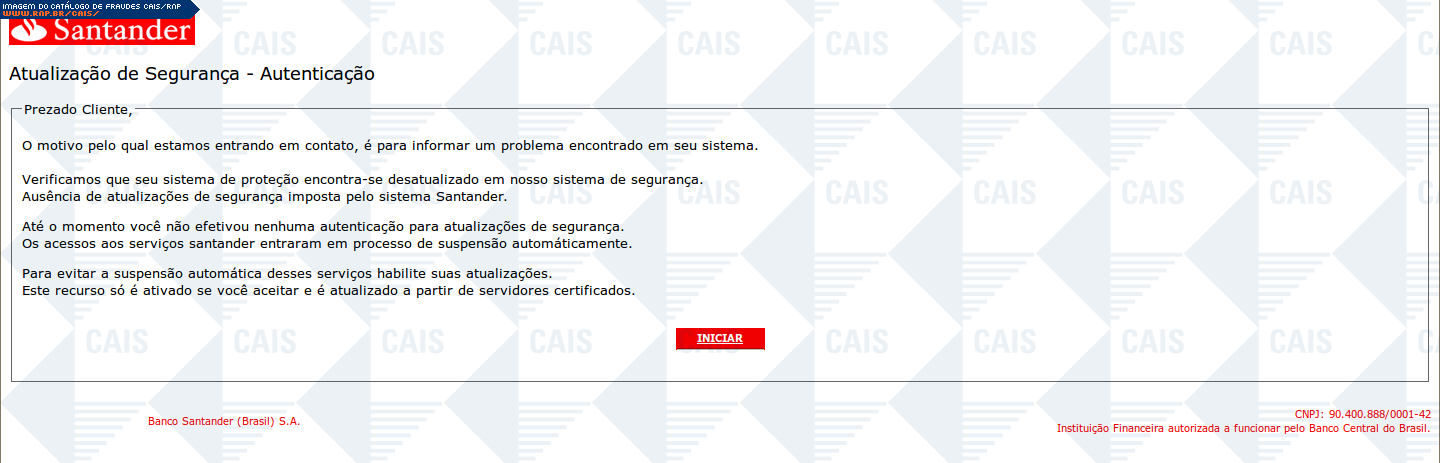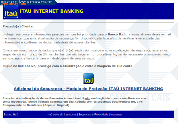 Esta página tem função informativa e educativa. Exibe uma coleção de imagens de phishing scam (fraudes eletrônicas) ou malware (código malicioso) veiculados por meio de spam (e-mail não-solicitado). Trata-se de conteúdo exemplificativo, não exaustivo, uma vez que não é possível contemplar todos os casos de fraudes existentes. Assim, caso você tenha conhecimento de um exemplar que não esteja aqui presente, isto não significa que não seja válido ou real. Inclusive incentivamos que você o envie para análise do CAIS para que, se for o caso, passe a integrar o nosso acervo.