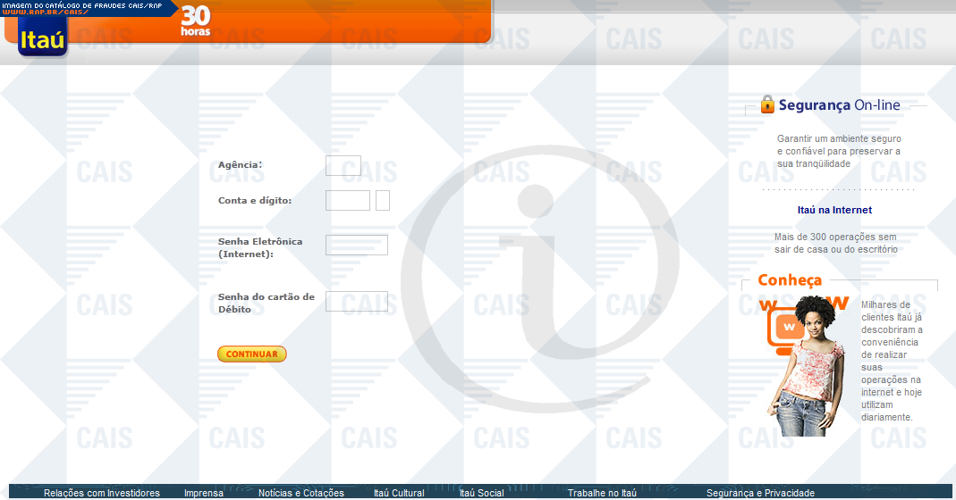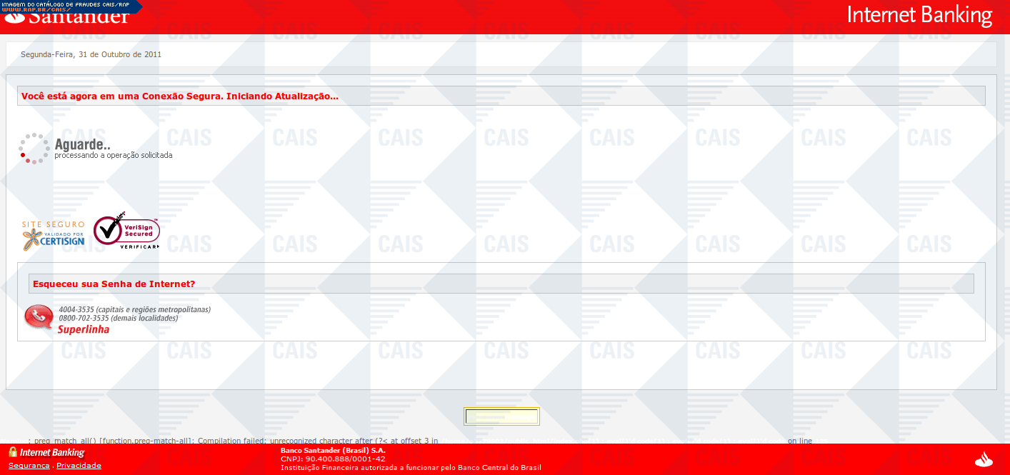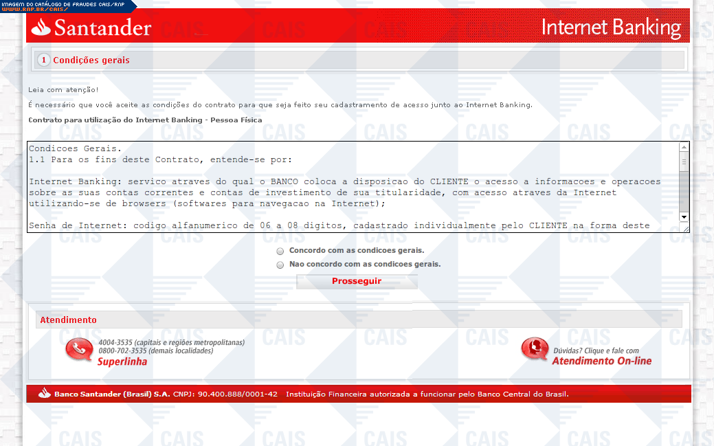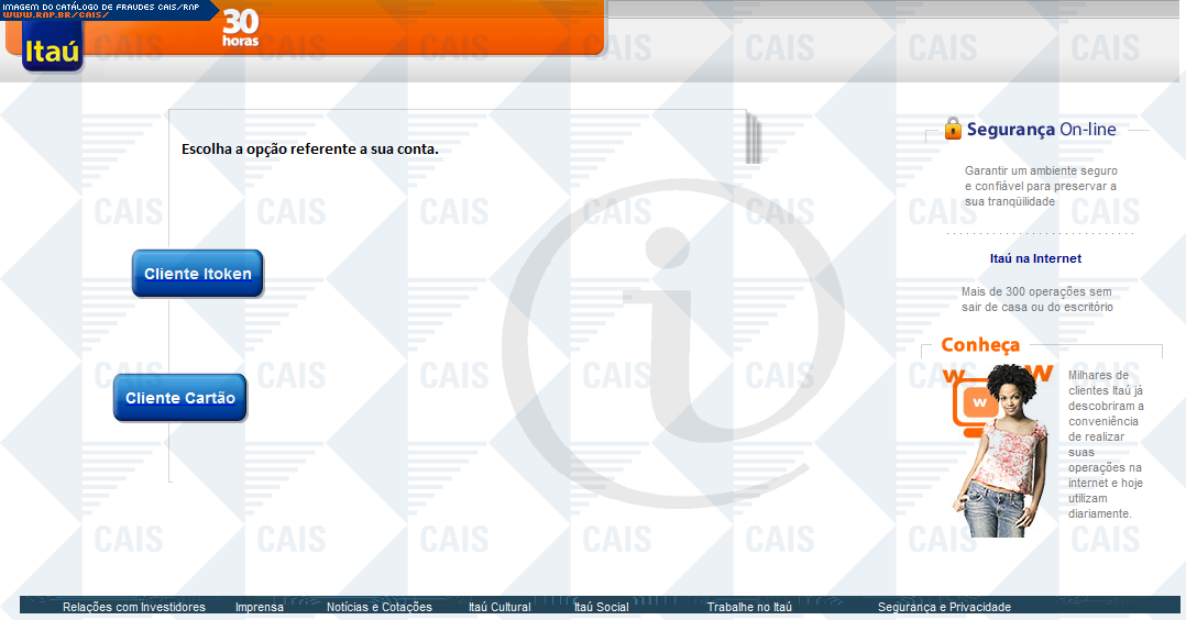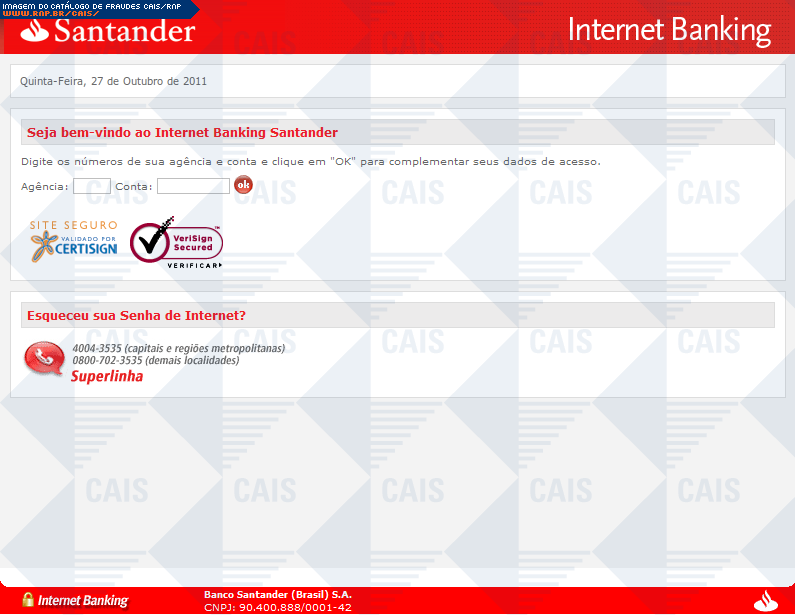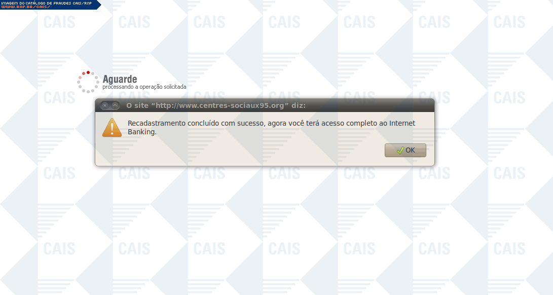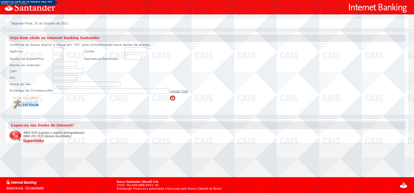 Esta página tem função informativa e educativa. Exibe uma coleção de imagens de phishing scam (fraudes eletrônicas) ou malware (código malicioso) veiculados por meio de spam (e-mail não-solicitado). Trata-se de conteúdo exemplificativo, não exaustivo, uma vez que não é possível contemplar todos os casos de fraudes existentes. Assim, caso você tenha conhecimento de um exemplar que não esteja aqui presente, isto não significa que não seja válido ou real. Inclusive incentivamos que você o envie para análise do CAIS para que, se for o caso, passe a integrar o nosso acervo.