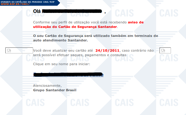 | comentário | A fraude, em nome do banco Santander, contém um link para que a vítima realize uma atualização falsa. O link leva a um site destinado a coletar dados da conta bancária da vítima. | |