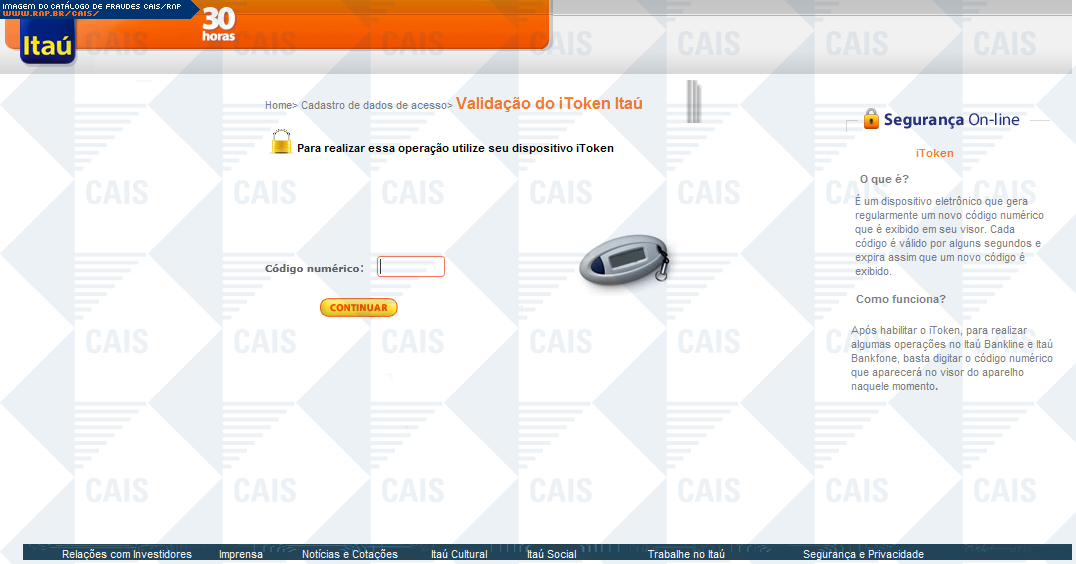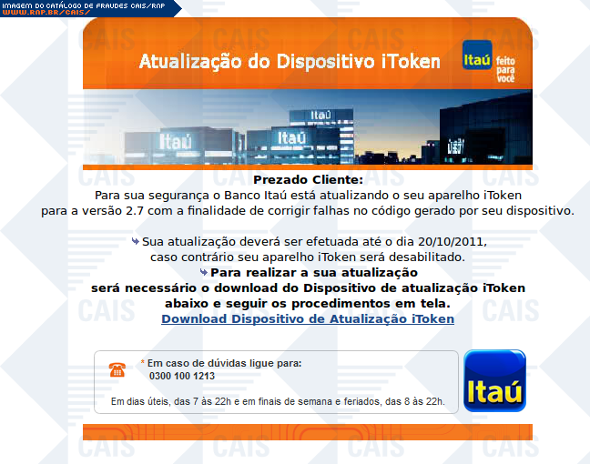| comentário | A fraude diz à vítima que ela deve atualizar seu dispositivo iToken para que possa corrigir falhas em seu dispositivo, e que para realizar essa atualização deve fazer o download de um arquivo provavelmente malicioso mas que não estava disponível no momento... (leia mais) | |