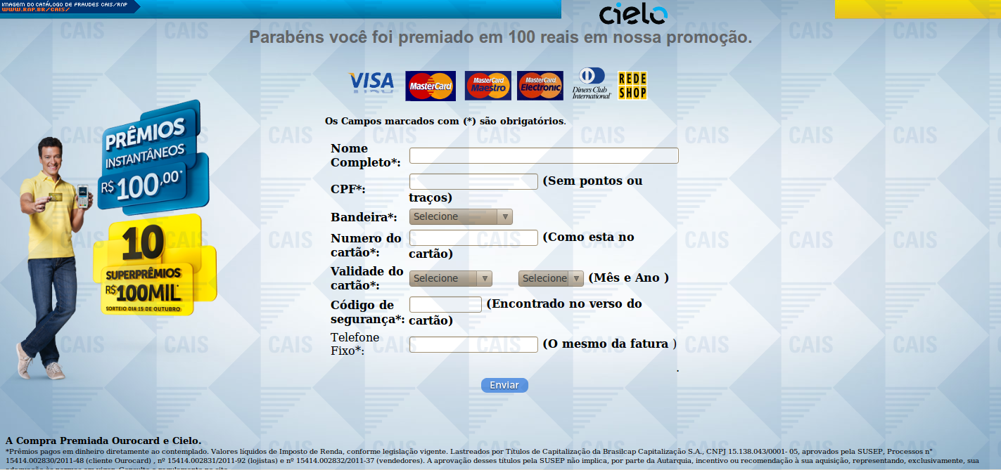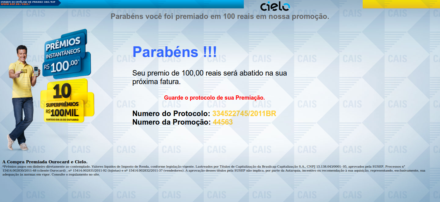| comentário | A mensagem diz à vítima que ela ganhou uma promoção e que deve confirmar o recebimento do prêmio. Para realizar a confirmação é nescessário clicar em um link disponível na mensagem e inserir todos os dados de cartão de crédito. A página é uma clara tentativa... (leia mais) | |