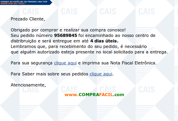 | comentário | O texto da fraude diz à vítima que ela fez uma compra que será entregue em breve, e contém um link para a impressão de sua nota fiscal eletrônica. O arquivo provavelmente tratava-se de um malware. Contudo, não estava disponível no momento da análise. | |