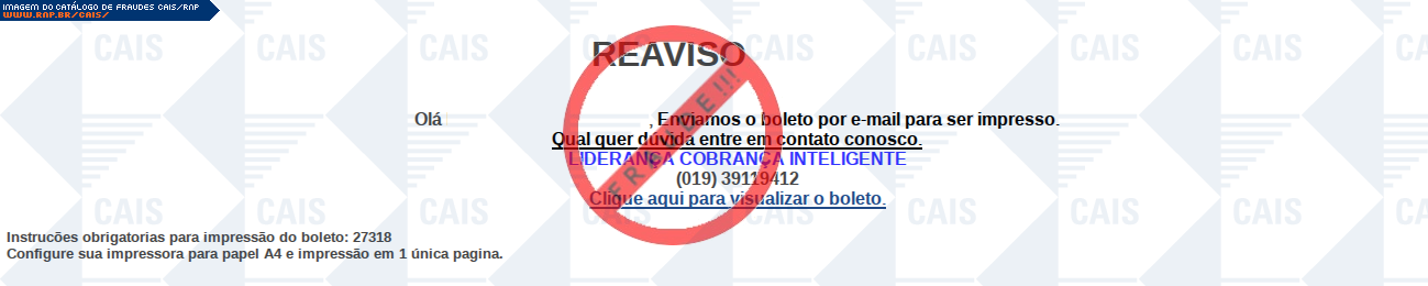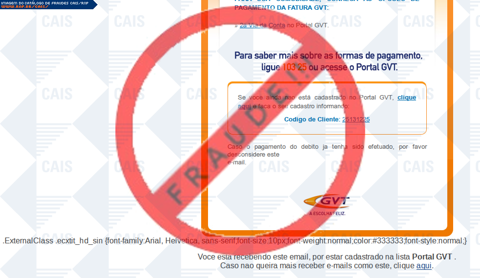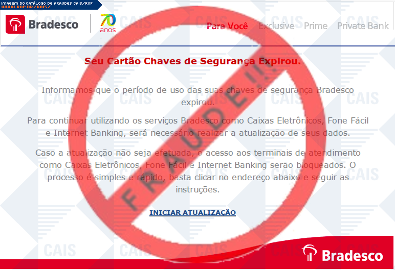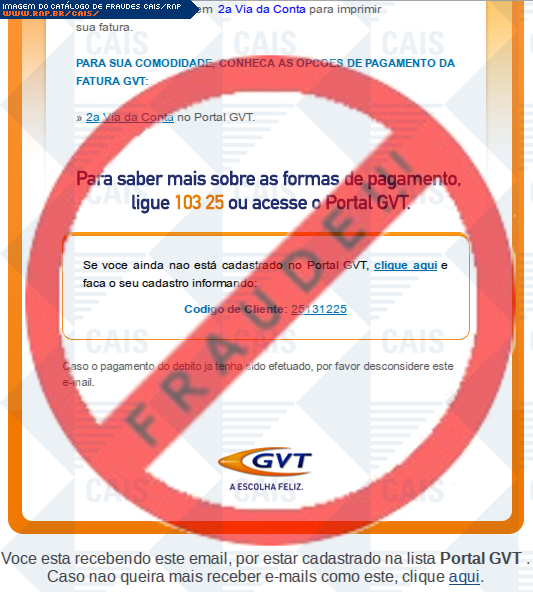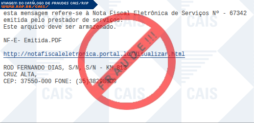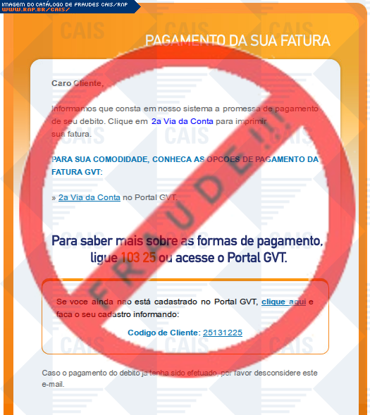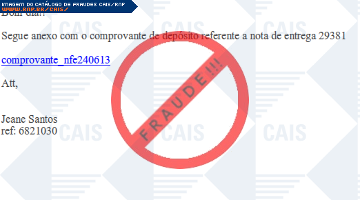 Esta página tem função informativa e educativa. Exibe uma coleção de imagens de phishing scam (fraudes eletrônicas) ou malware (código malicioso) veiculados por meio de spam (e-mail não-solicitado). Trata-se de conteúdo exemplificativo, não exaustivo, uma vez que não é possível contemplar todos os casos de fraudes existentes. Assim, caso você tenha conhecimento de um exemplar que não esteja aqui presente, isto não significa que não seja válido ou real. Inclusive incentivamos que você o envie para análise do CAIS para que, se for o caso, passe a integrar o nosso acervo.