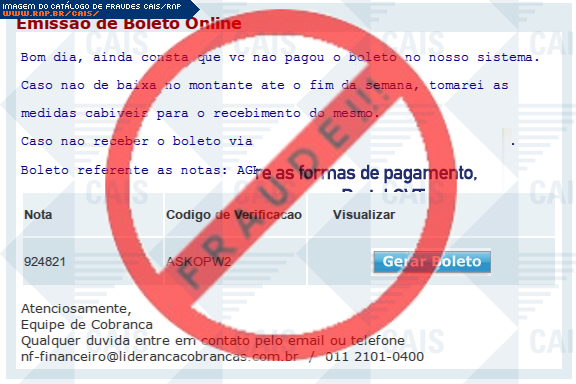 | comentário | Nessa fraude o usuário recebe um e-mail informando-o sobre a existência de um boleto pendente, mas ao tenta acessado clicando no botão gerar boleto do e-mail é feito o download de um malware. | |