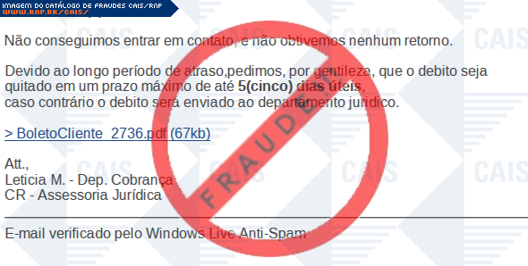 | comentário | Uma mensagem é enviada solicitando que o usuário realize o pagamento de um determinado debito em até 05 dias para evitar que seja enviado ao departamento juridico, mas ao tentar acessar o boleto é feito o download de um malware. | |