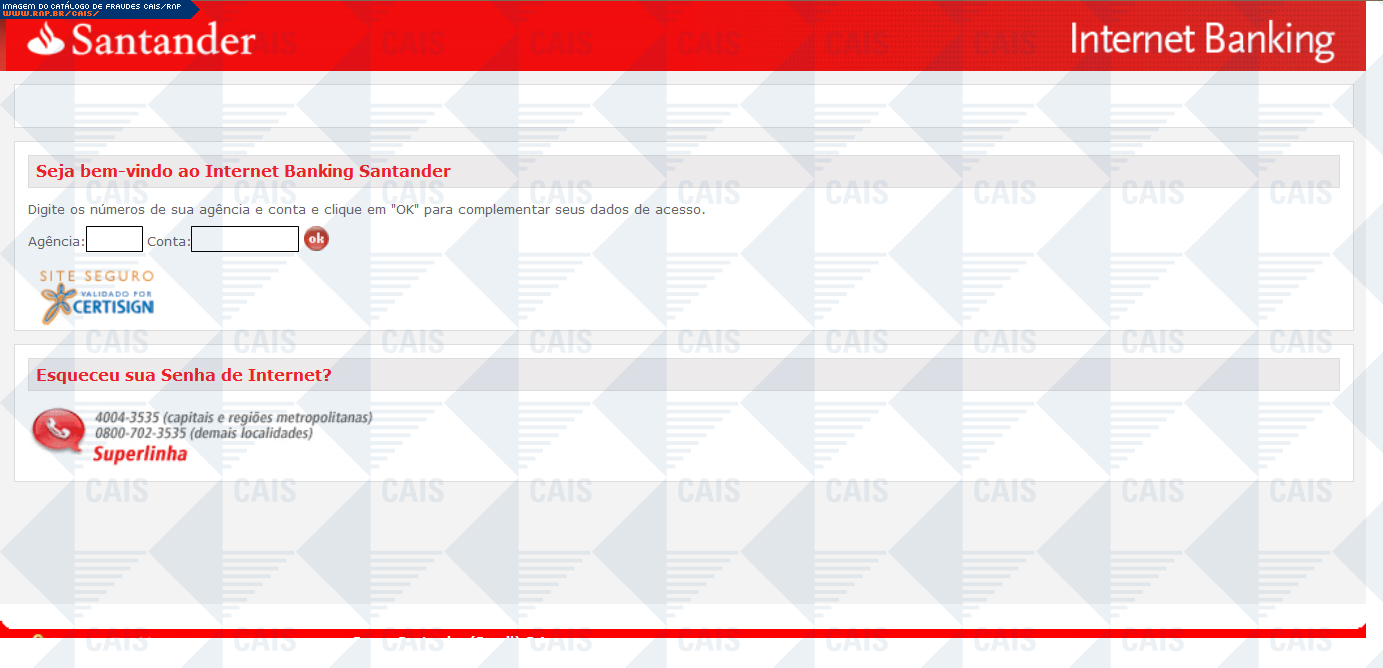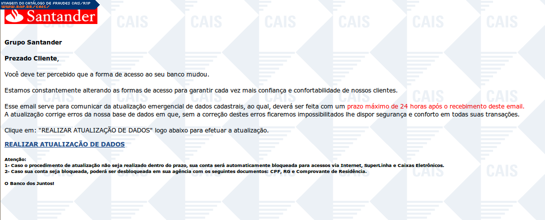 Esta página tem função informativa e educativa. Exibe uma coleção de imagens de phishing scam (fraudes eletrônicas) ou malware (código malicioso) veiculados por meio de spam (e-mail não-solicitado). Trata-se de conteúdo exemplificativo, não exaustivo, uma vez que não é possível contemplar todos os casos de fraudes existentes. Assim, caso você tenha conhecimento de um exemplar que não esteja aqui presente, isto não significa que não seja válido ou real. Inclusive incentivamos que você o envie para análise do CAIS para que, se for o caso, passe a integrar o nosso acervo.