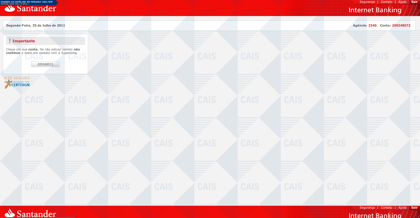 | comentário | A mensagem informa que, devido ao novo acesso ao banco Santander, a vítima deve atualizar seus dados. O conteúdo malicioso já havia sido removido no momento da análise. | |