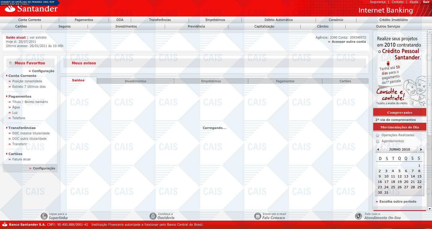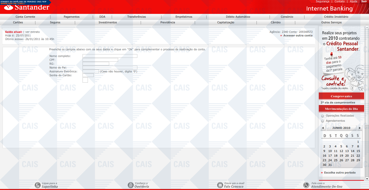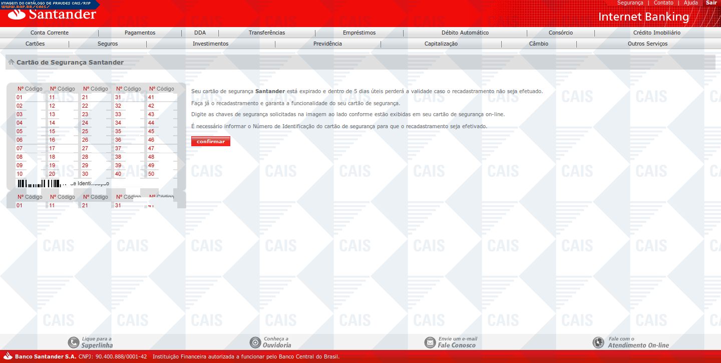 | comentário | Mensagem falsa do banco Santander contendo um link para um suposto recadastramento de dados. O link leva a uma página falsa, destinada a roubar dados da conta bancária da vítima. | |