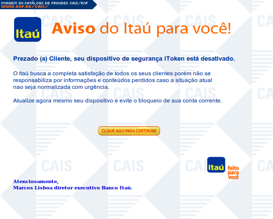 | comentário | Comunicado falso, em nome do banco Itaú, informando que o iToken está desativado. O link para a ativação leva a conteúdo malicioso que não estava mais disponível no momento da análise. | |