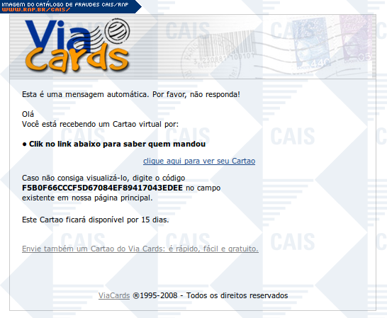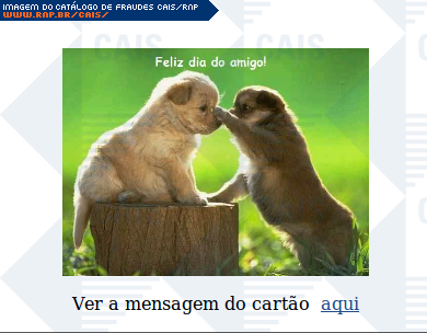 | comentário | A mensagem se passa pelo envio de um cartão virtual. O link para o suposto cartão leva ao software malicioso que foi identificado como Trojan.Generic.KD.298537 (BitDefender). | |
