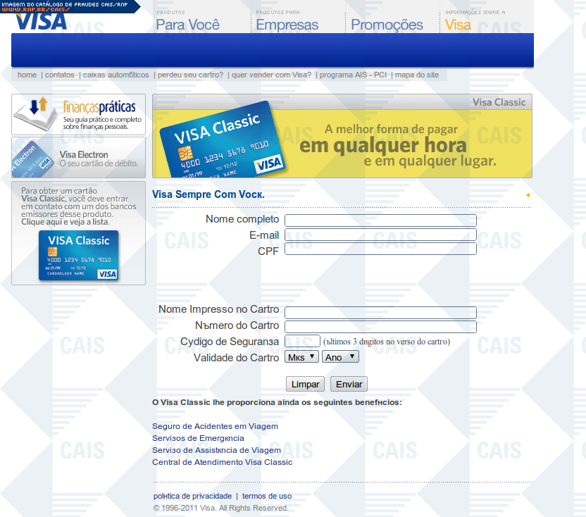 | comentário | A mensagem usa o nome da visa para anunciar uma promoção. O link para o cadastro leva a uma página falsa, destinada a coletar dados do cartão de crédito da vítima. | |
