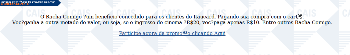 | comentário | A mensagem em nome da Cielo contém um link para o cadastro na promoção Fatura Zero. O link leva a uma página de cadastro falsa, destinada a roubar dados do cartão de crédito da vítima. | |
