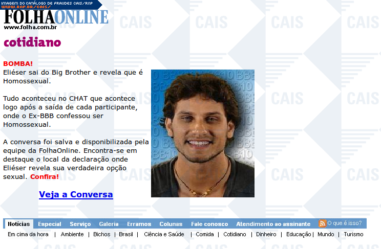 | comentário | Mensagem com suposta reportagem da Folha de São Paulo online dizendo que o participante do programa Big Brother Brasil 10 Eliéser confessou ser homossexual. A confissão, segundo o texto, teria sido feita no chat após a eliminação do participante. A fraude... (leia mais) | |