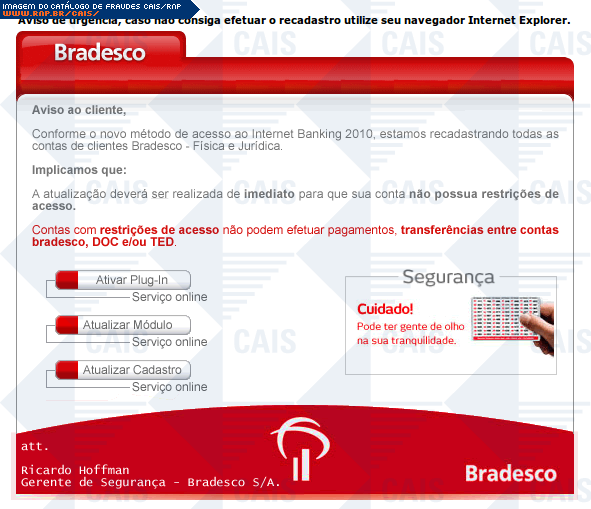 | comentário | Mensagem se passando pelo banco Bradesco dizendo que devido ao novo método de acesso ao Internet Banking é necessário que todas as contas sejam recadastradas. O não recadastramento implicaria em restrições de acesso à conta, impossibilitando a realização... (leia mais) | |