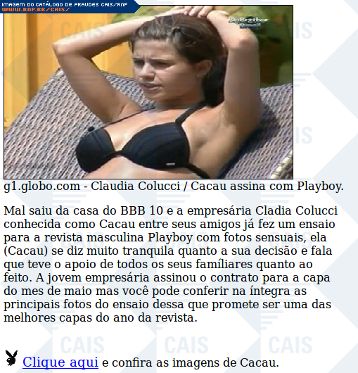 | comentário | Fraude com suposta notícia da globo.com dizendo que a ex-participante do programa Big Brother Brasil 10, Cláudia, fez um ensaio para a revista Playboy. Segundo o texto, a revista seria lançada em maio mas algumas das fotos já poderiam ser vistas através de... (leia mais) | |