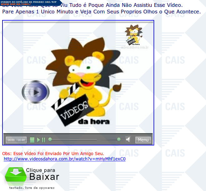 | comentário | Mensagem contendo suposto vídeo interessante do site Videos da Hora. Contud, o link para o vídeo leva a conteúdo malicioso não disponível no momento da análise. | |