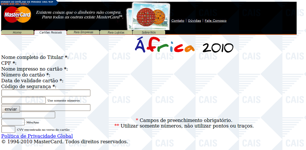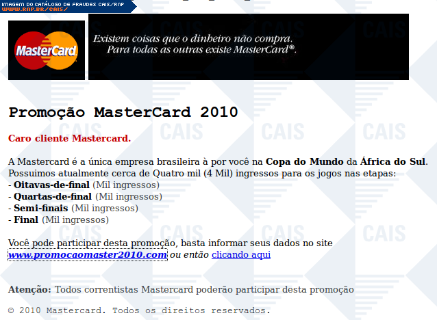 | comentário | Fraude se passando por comunicado da MasterCard a respeito de promoção para ganhar ingressos para a Copa do Mundo de 2010. Um link presente na mensagem leva a uma página falsa destinada a roubar dados do cartão de crédito da vítima. | |