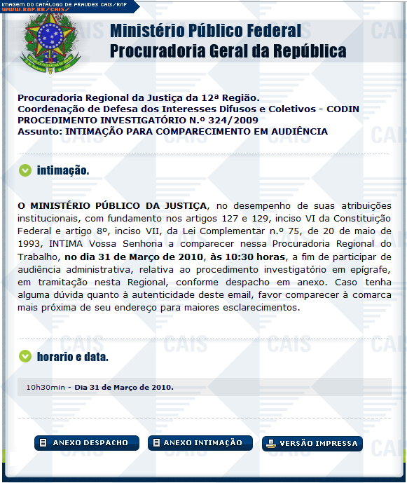 | comentário | Mensagem falsa se passando por intimação do Ministério Público Federal para comparecimeto em audiência. A fraude contém links que supostamente para anexo com a intimação, na qual poderiam ser encontrados maiores detalhes. Os links levam a um malware identificado... (leia mais) | |